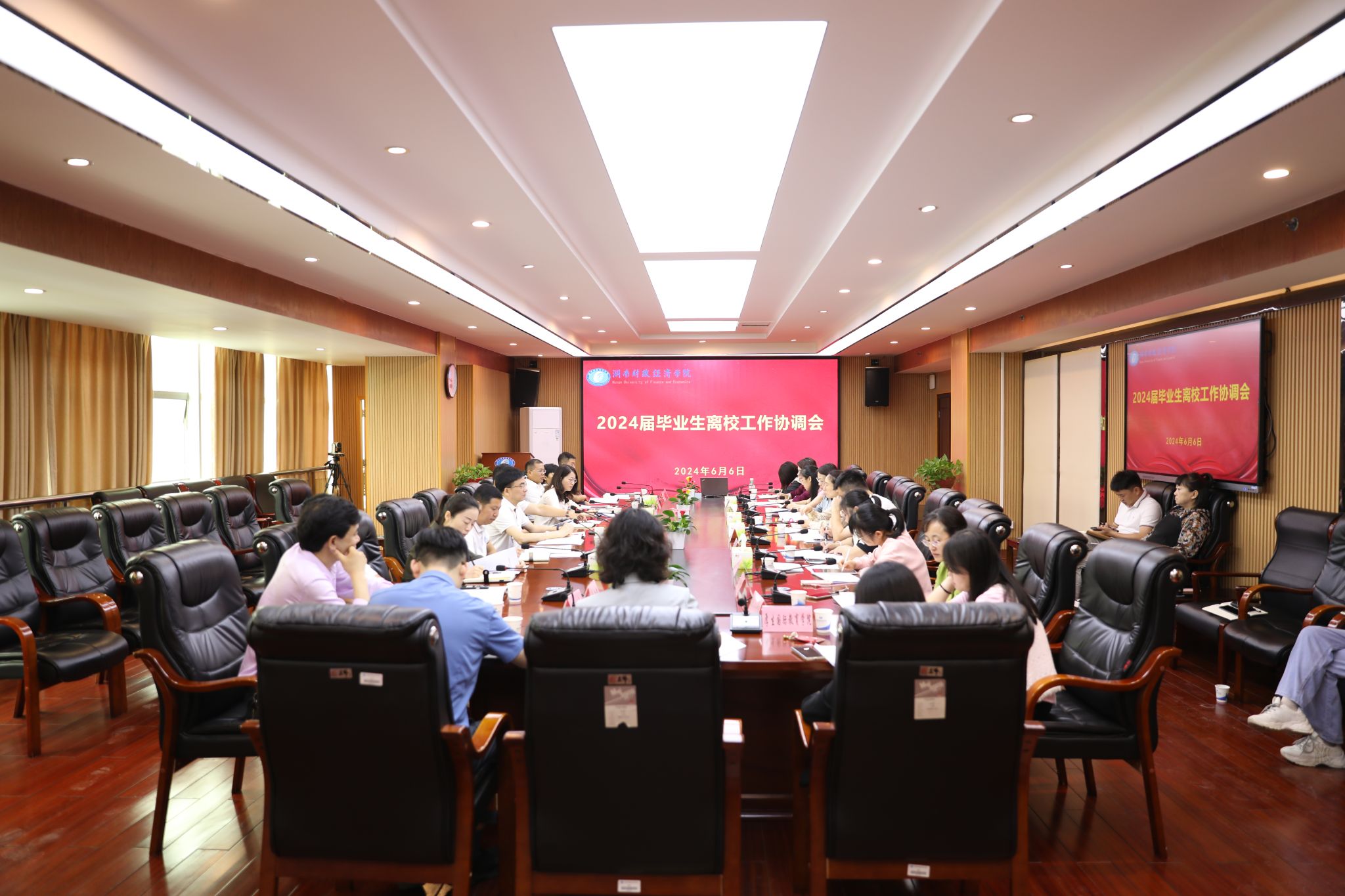 (本网讯)6月6日上午,学校在办公楼715会议室召开2024届毕业生离校工作协调会,安排部署毕业生离校工作。副校长郭国强主持会议,相关职能部门负责人、各二级学院学工负责人参加。会议现场会上,学生工作部部长欧阳海峰详细解读了毕业生离校工作方案,梳理了工作流程,进一步明确了毕业生离校工作时间节点安排。与会人员就毕业生离校安排、后勤保障、毕业典礼等工作进行了充分沟通与协调。郭国强强调,各部门、各二级学院要以生为本,...