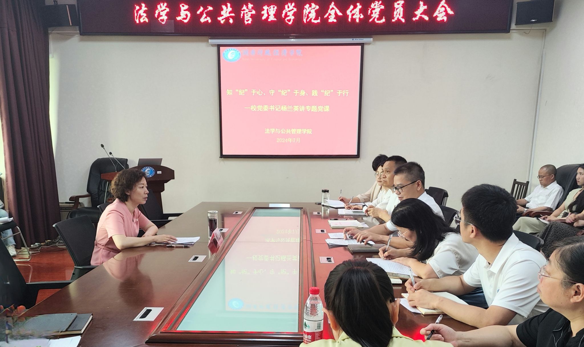 (本网讯)为进一步推动党纪学习教育走深走实,7月3日上午,校党委书记杨兰英在办公楼414-2会议室为法学与公共管理学院师生党员讲授“知‘纪’于心、守‘纪’于身、践‘纪’于行”党纪学习教育专题党课。党课现场杨兰英指出,开展党纪学习教育是以习近平同志为核心的党中央作出的重大决策部署,是加强党的纪律建设、推动全面从严治党向纵深发展的重要举措,是当前和今后一个时期的重要政治任务。加强纪律建设是中国共产党的光荣传统和独特优势,...