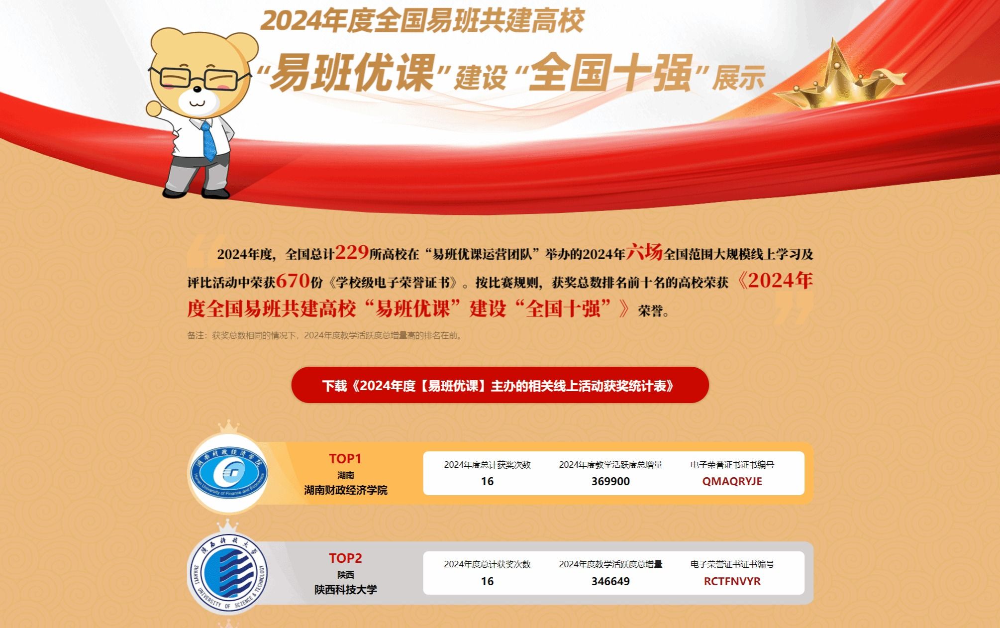 (本网讯)近日,2024年度全国易班共建高校“易班优课”建设评选结果公布,best365官网荣获2024年度全国易班共建高校“易班优课”建设“全国十强”荣誉。这是best365官网继2021年以来,第三次获得此项殊荣。2024年,学校借助“易班优课”平台开设了33个优课课程,获得2024年1-10月全国易班优课月度优秀十佳案例、2024年第一届易班优课求职辅导课程学习大赛优秀组织奖、2024年易班网第四届全国大学生简历设计大赛优秀组织奖、2024年易班优课高校美食文化图文课大赛优秀组织奖、...