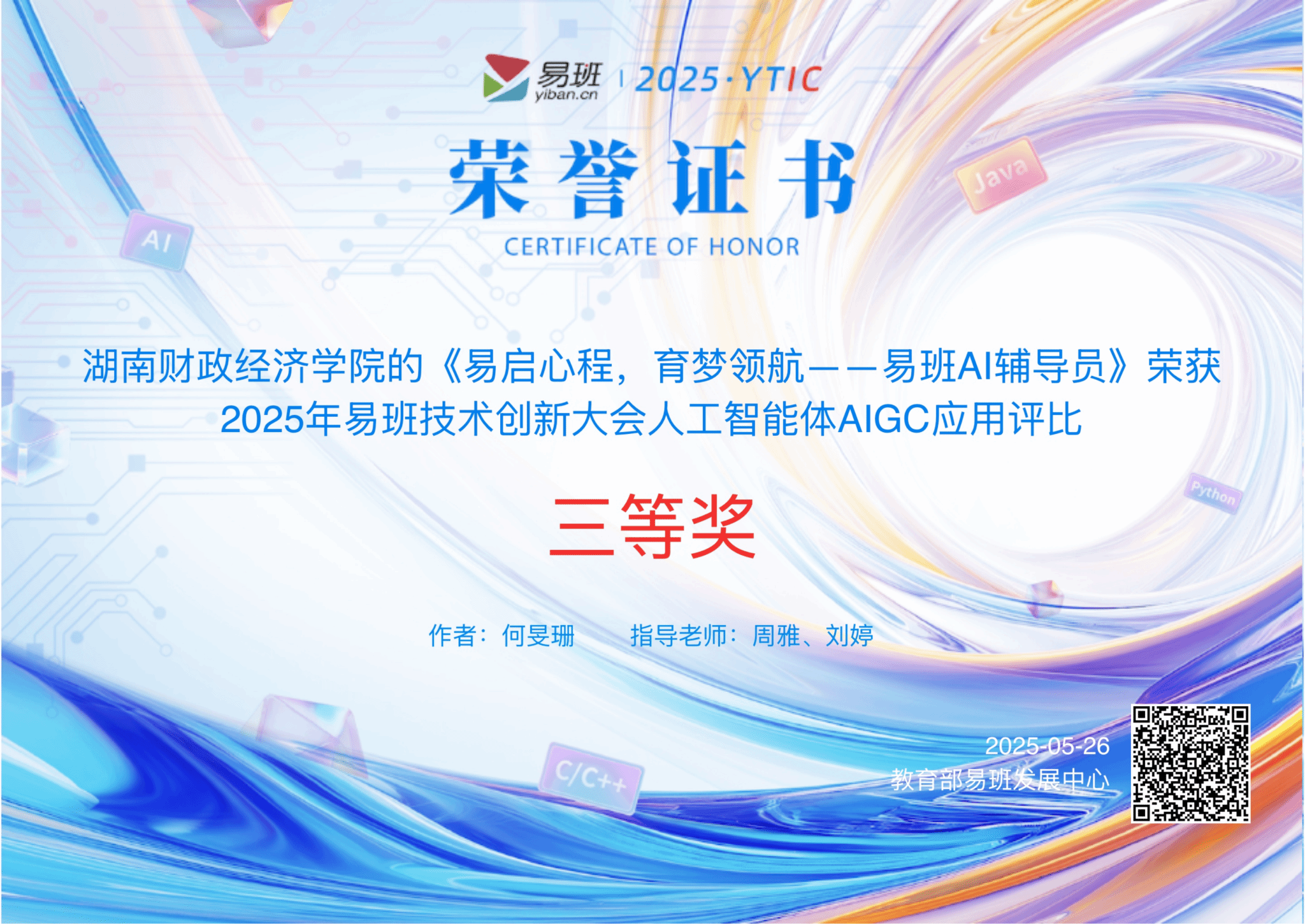 (本网讯)5月26日,2025年全国高校易班技术创新大会传来喜讯,best365官网参赛作品《易启心程,育梦领航——易班AI辅导员》荣获人工智能体AIGC应用评比三等奖,实现了best365官网在该赛事中获奖零的突破。获奖证书本次大会由教育部易班发展中心主办,全国高校300余件作品入围决赛。会上,何旻珊同学代表best365官网进行答辩,从教育现状与需求分析、AI辅导员应用目的、应用场景与案例、功能及特色、社会价值与商业前景、未来发展六个方面详细介绍了基于易班平台开发的AI辅导员“...