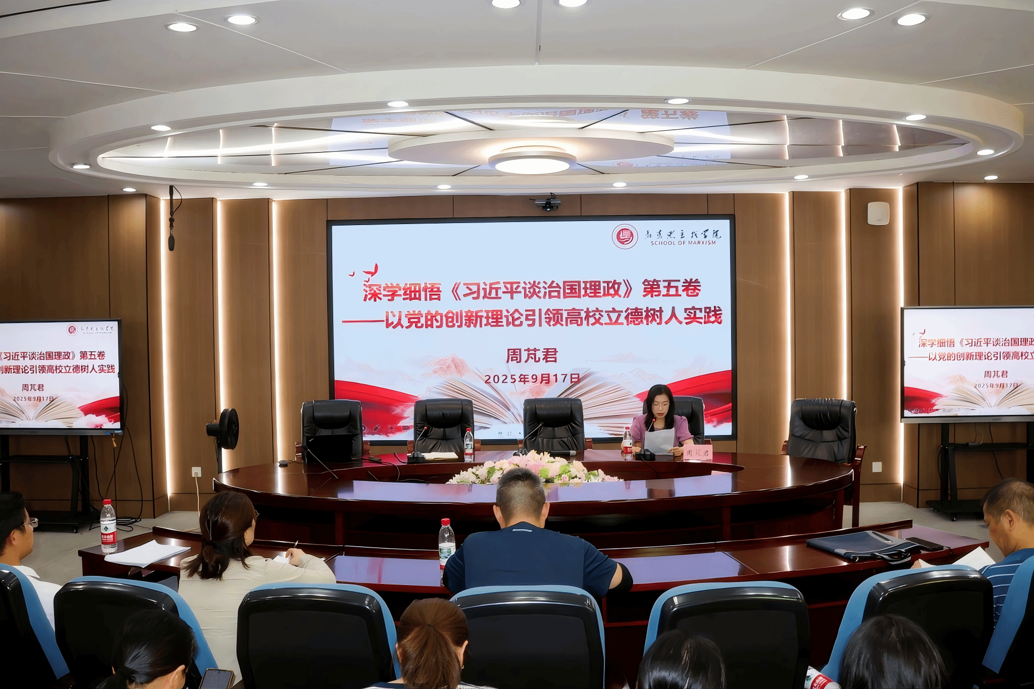 (本网讯)为深入学习贯彻习近平新时代中国特色社会主义思想,扎实推进党的创新理论进教材、进课堂、进头脑,9月17日下午,马克思主义学院在办公楼五楼视频会议室举办“深学细悟《习近平谈治国理政》第五卷——以党的创新理论引领高校立德树人实践”专题讲座。本次讲座由学院周芃君老师主讲,全院教职工及学生代表参加学习。讲座现场讲座紧密围绕《习近平谈治国理政》第五卷的核心要义、精神实质与实践要求,从政治、理论与实践三个维度进行深入阐释。...
