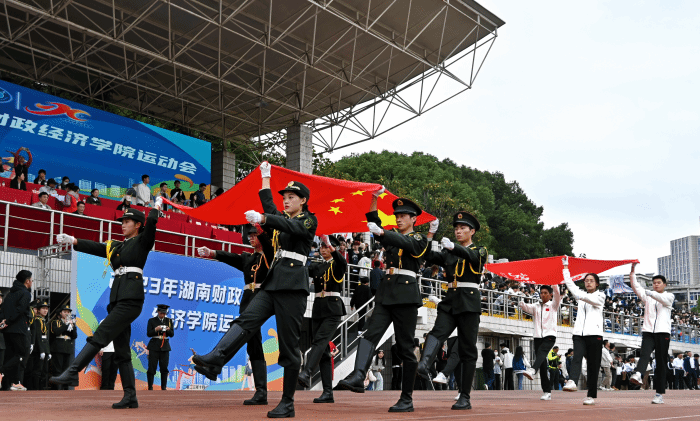 8时,运动会入场式开始,在国旗、校旗和彩旗方阵的引领下,教工方阵、14个二级学院方阵以整齐的步伐和昂扬的姿态依次进入田径场,走过主席台,舞蹈、朗诵、武术等元素被他们融入进了开幕式方阵表演中,各具创意的展现形式传递出湖财师生的励志情怀和共迎校运会的喜悦之情。