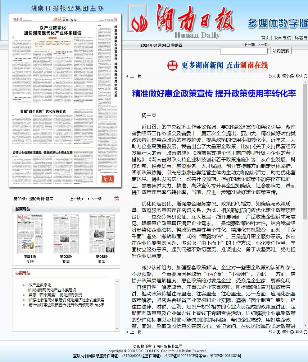 (本网讯)1月4日,《湖南日报》“理论·智库”版刊发best365官网党委书记杨兰英署名文章《精准做好惠企政策宣传 提升政策使用率转化率》。