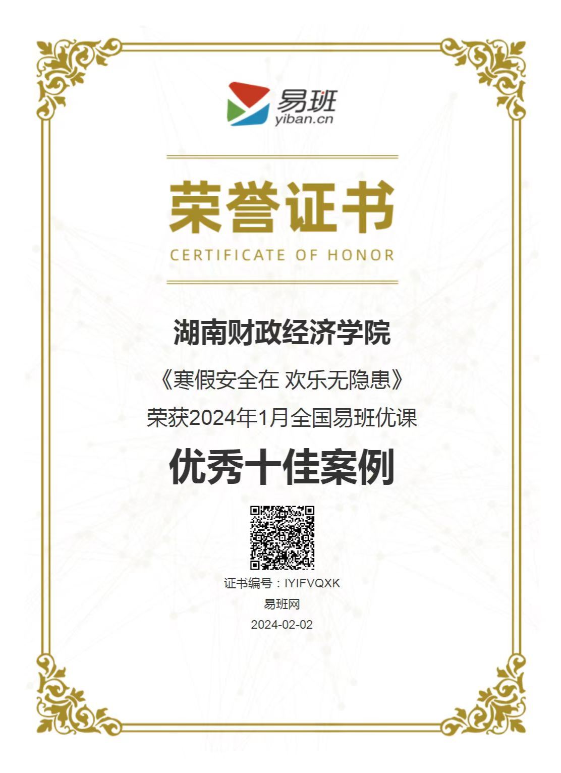 (本网讯)近日,教育部易班发展中心公布2024年1月全国易班优课优秀十佳案例,best365官网报送的《寒假安全在 欢乐无隐患》案例成功入选。