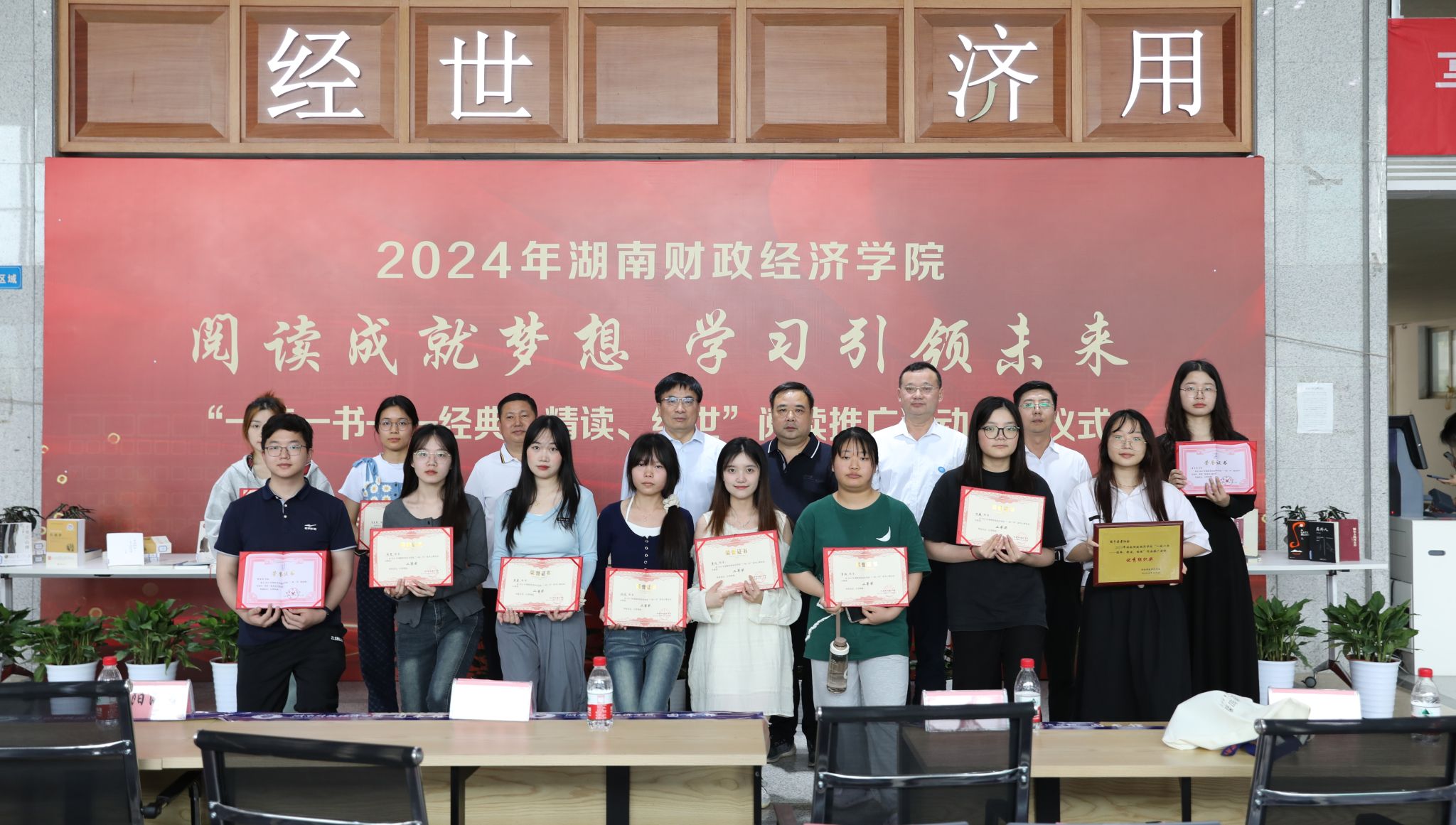 图书馆副馆长饶志英宣读了学校2023年度“一校一书”阅读推广活动获奖名单:钟财龙、黄欣怡同学获得湖南省教育厅“优秀读书报告奖”,周雅老师被评为湖南省高校图书情报工作委员会优秀阅读推广人,学生工作处易班工作站《品红色文化,促长来振兴》获得湖南省高校图书情报工作委员会创新案例奖,会计学院、图书馆读者协会获校级优秀组织奖荣誉称号,朱弥等6名老师同学被评为校级优秀阅读推广人,66名同学获得校级读书报告奖。参会嘉宾为获奖者颁发了荣誉证书。