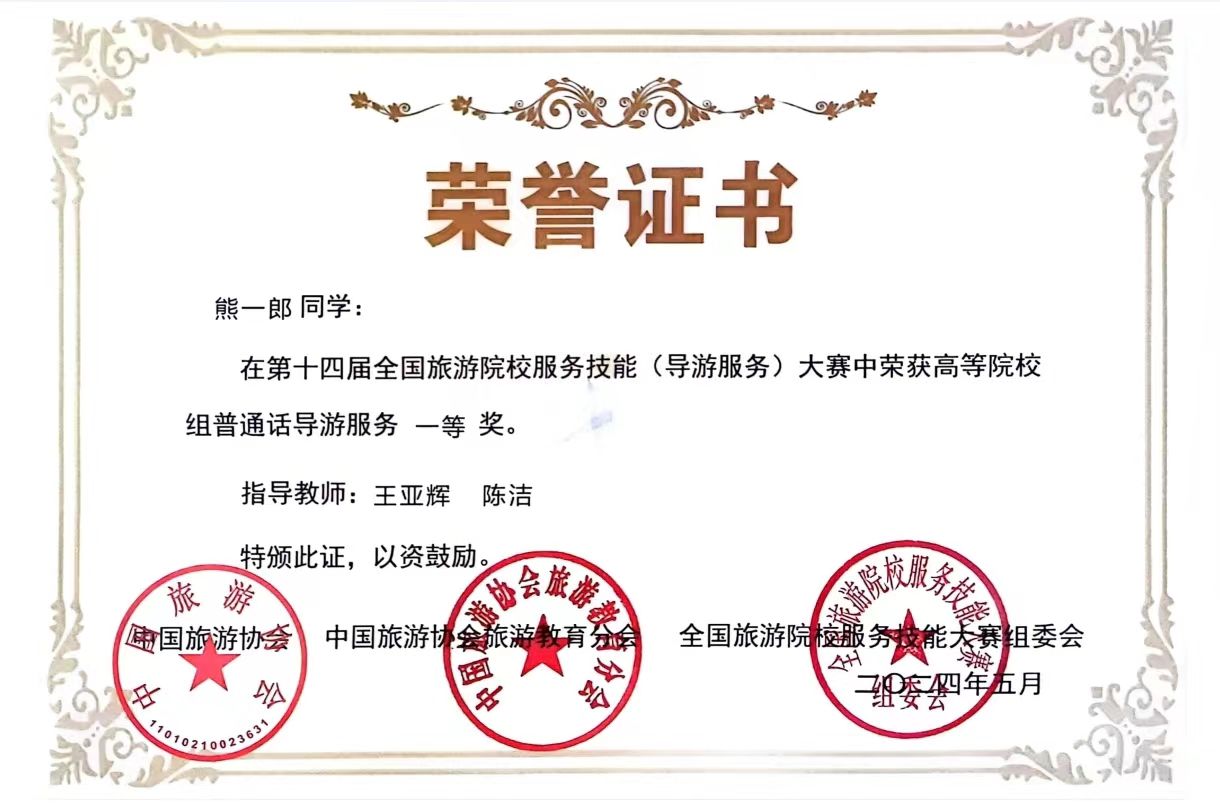 据了解,熊一郎自入校以来,积极参与专业技能竞赛,曾获得第十三届全国大学生红色旅游创意策划大赛全国特等奖和个人最佳风采奖,创best365官网参加该项赛事以来最好成绩。
