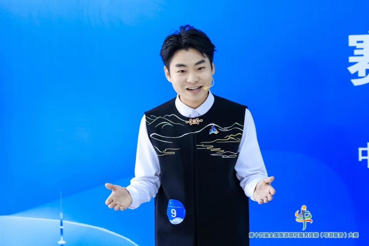 比赛分理论测试、导游讲解(现场)和才艺展示三个环节。熊一郎发挥出色,理论测试拿到满分;在现场讲解环节,他以研学导游身份带来了一场生动且民族味十足的研学解说;在才艺展示环节,他一首高亢激昂的《小白杨》,深深打动在场评委获得高分。