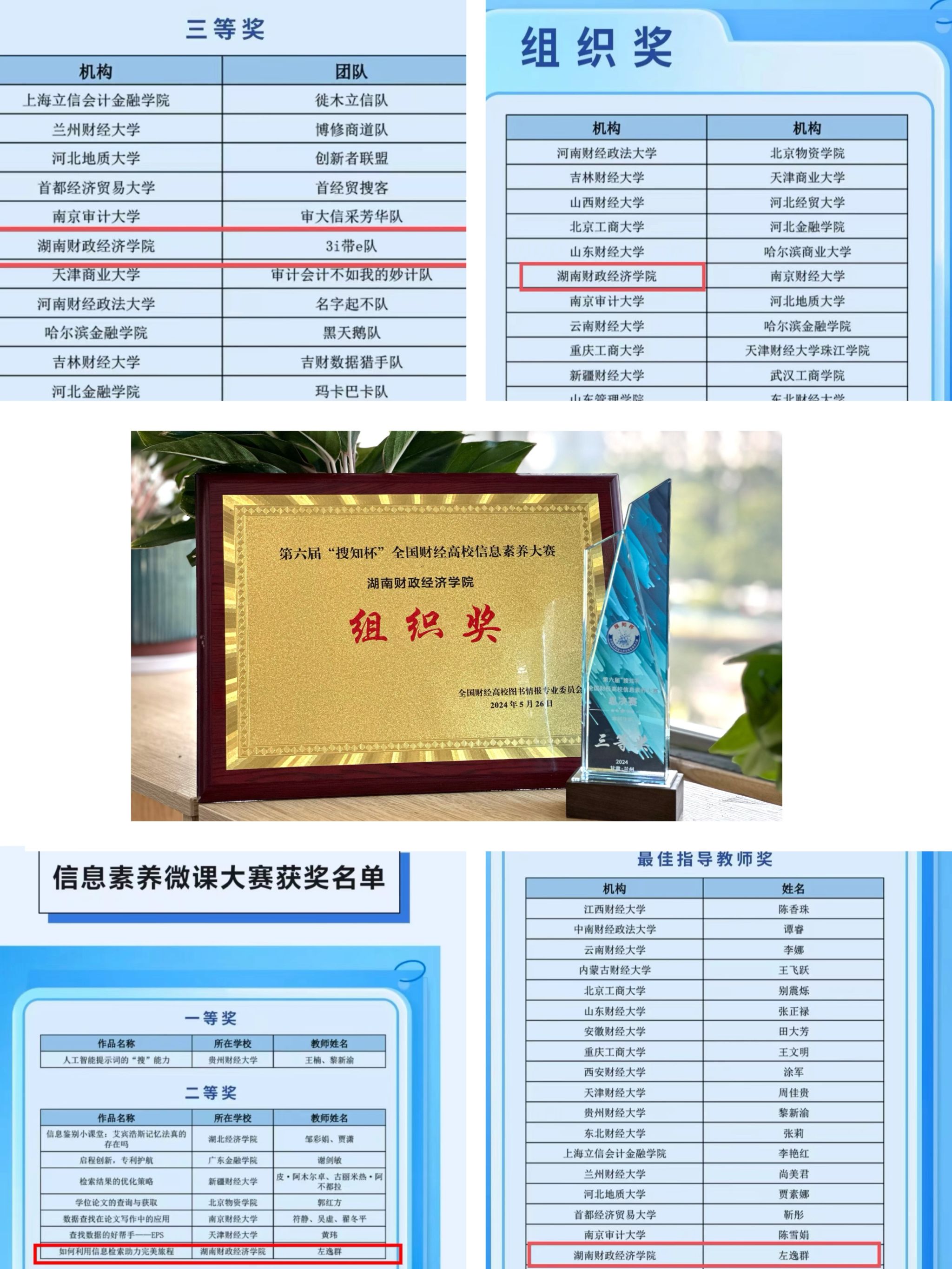 (本网讯)5月26日,第六届“搜知杯”全国财经高校信息素养大赛总决赛圆满落幕,best365官网与进入决赛的38支本科组队伍同台竞技,最终获得全国总决赛团体三等奖(本科生组),指导老师左逸群获得教师组微课大赛二等奖、最佳指导教师奖,学校获得组织奖。