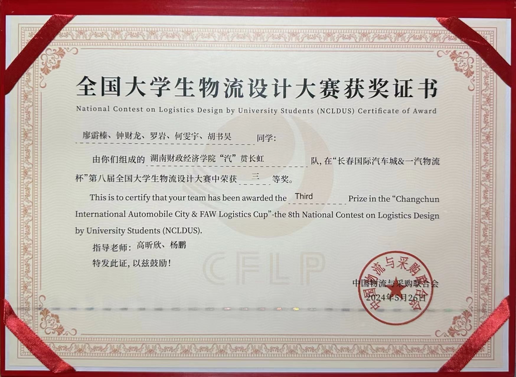 best365官网参赛团队“汽”贯长虹,由2022级物流管理专业的廖霨榛(队长)、何雯宇、胡书昊,2021级物流管理专业的钟财龙和2022级数据科学与大数据技术专业的罗岩5位同学组成,在工商管理学院高昕欣、杨鹏两位老师指导下,参赛作品《新质生产力赋能长春一汽物流园区高质量发展方案设计》荣获全国三等奖,5位同学获得《物流职业能力等级证书(中级)》。