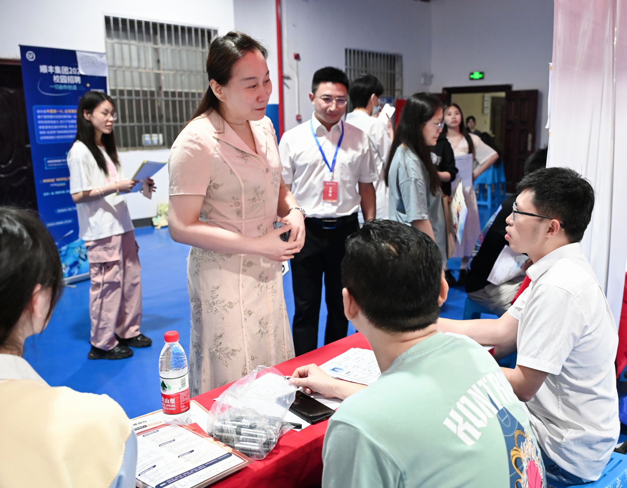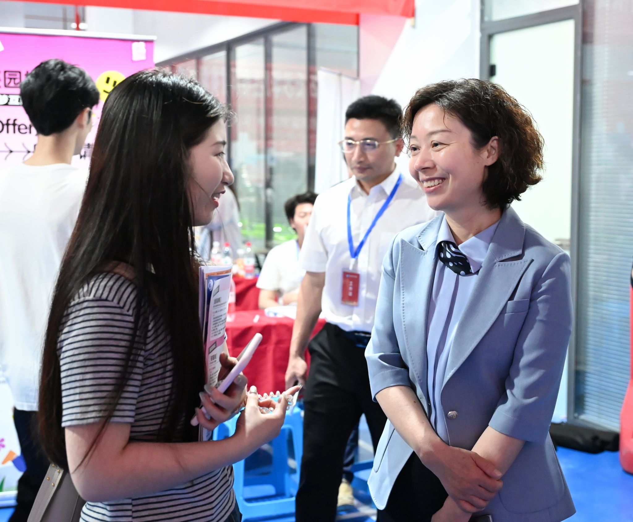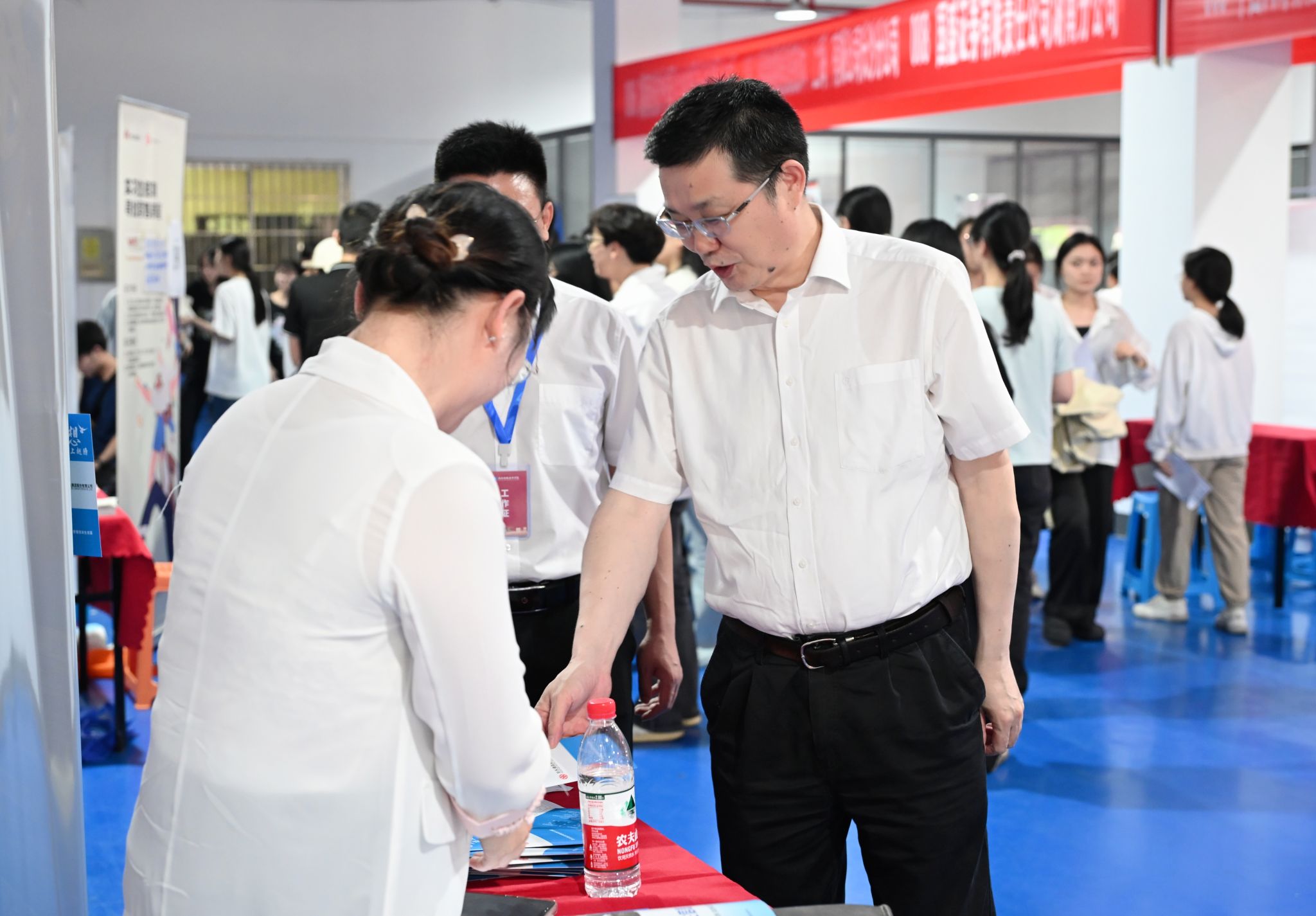 (本网讯)6月3日下午,学校主校区体育馆一楼内学子云集,热闹非凡。学校2024届未就业毕业生暨2025届实习生专场招聘会在此举行,193家企业与4500多名湖财学子“双向奔赴”。校党委书记杨兰英、校长刘长庚、党委副书记苏玲深入现场调研指导工作。
