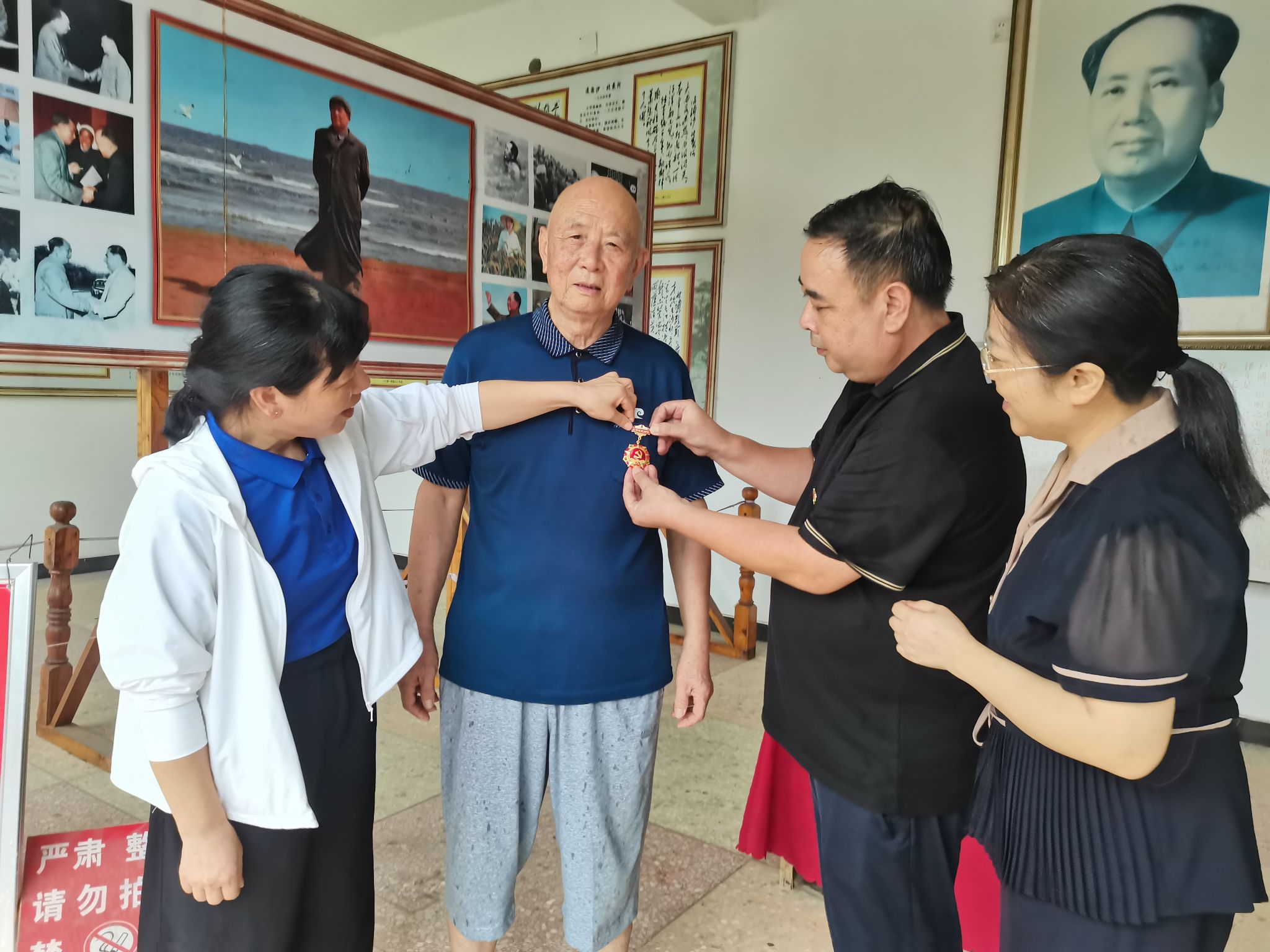 校党委委员、宣传统战部部长文炳勋(右二)为老党员谢和刚(左二)送上“光荣在党50年”纪念章