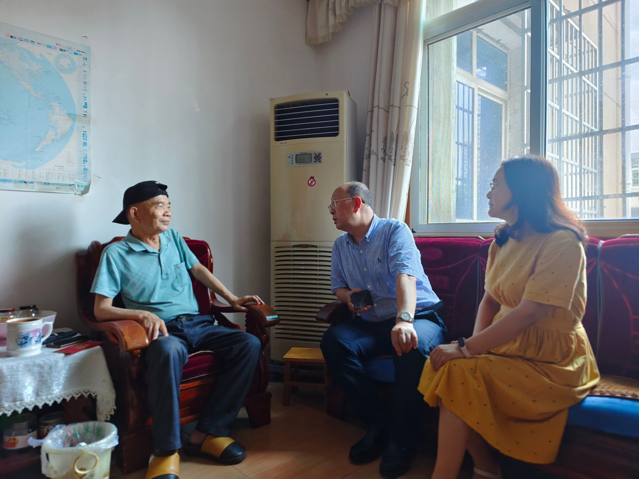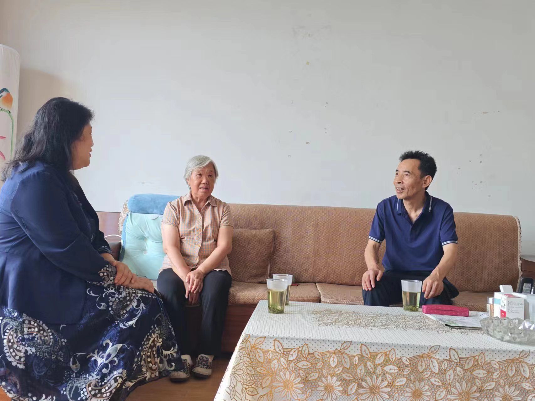 校党委书记杨兰英(左)慰问老党员符方照(中)、吴安喜(右)