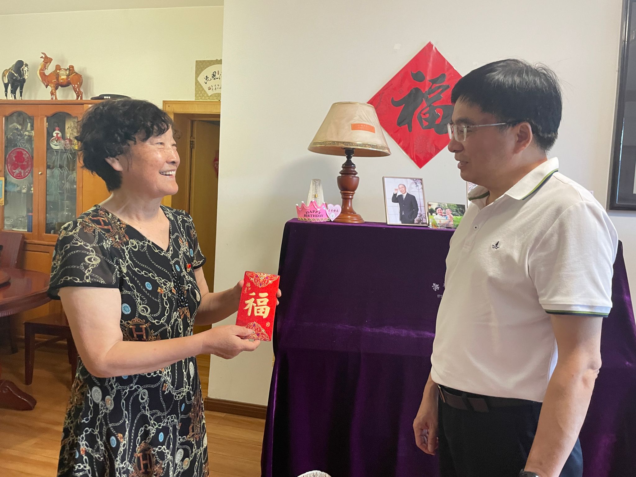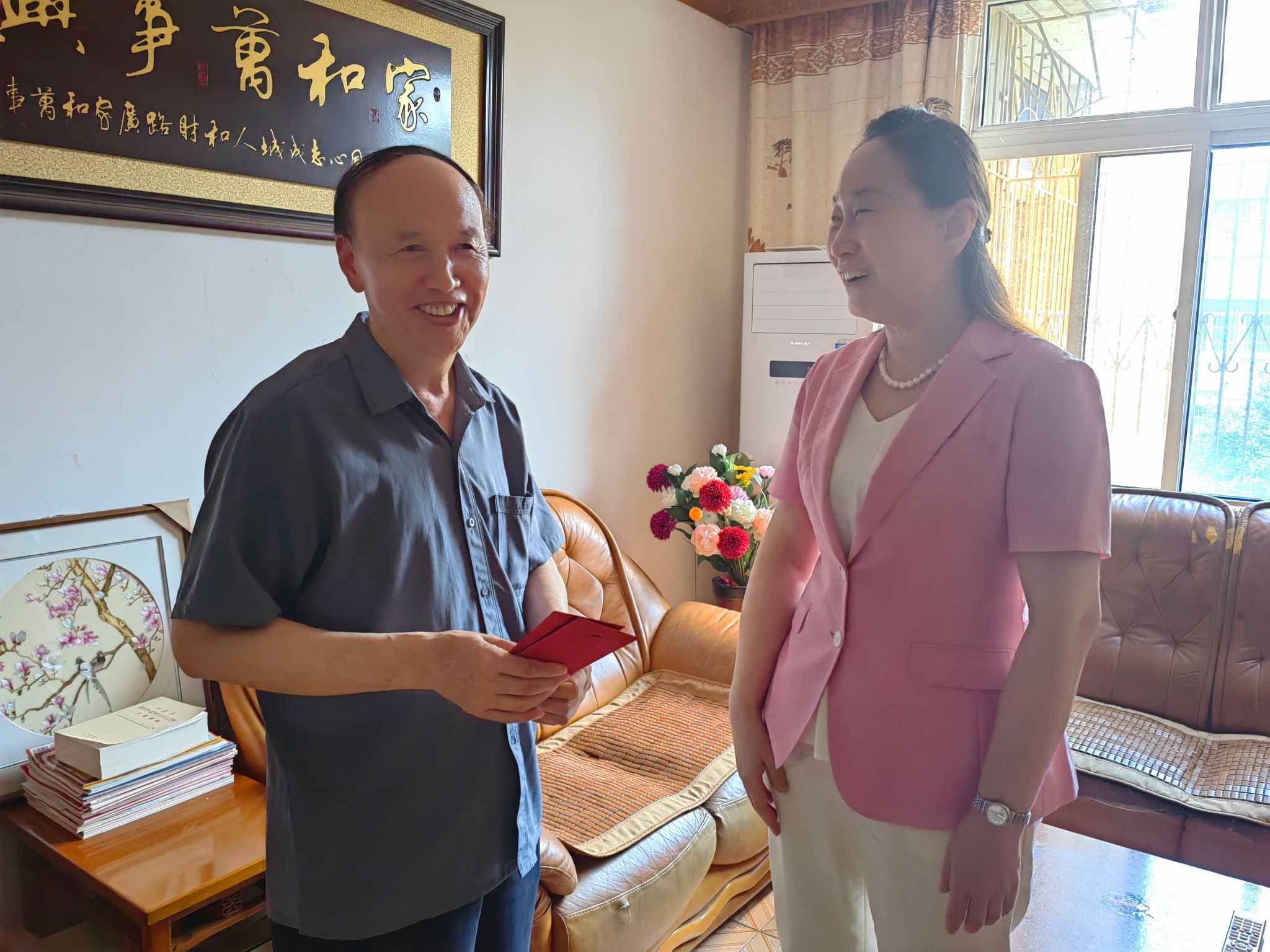 副校长郭国强(右)慰问老党员江红(左)