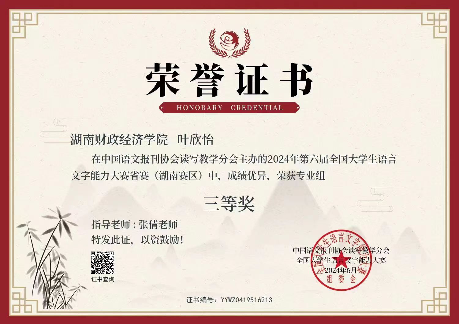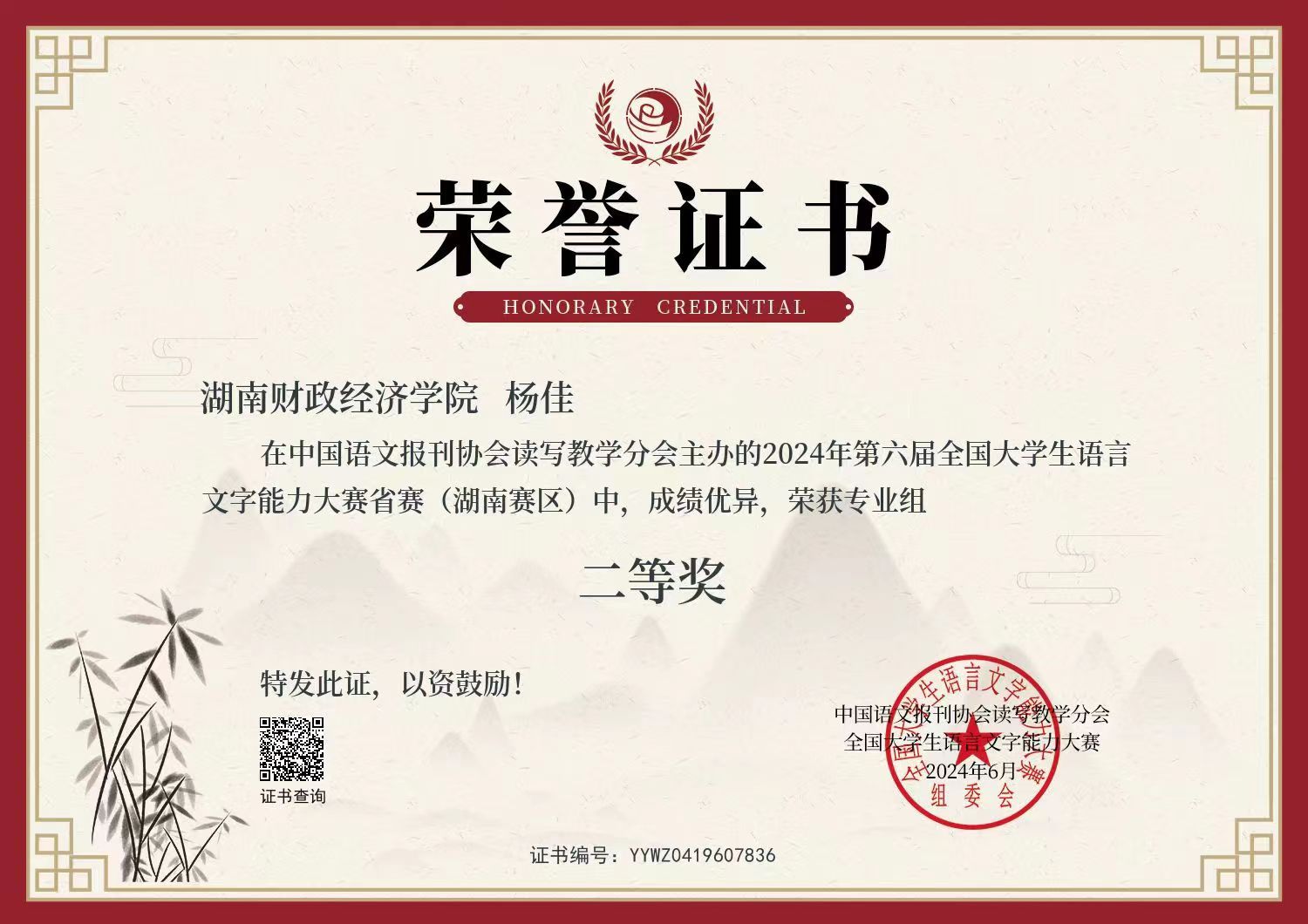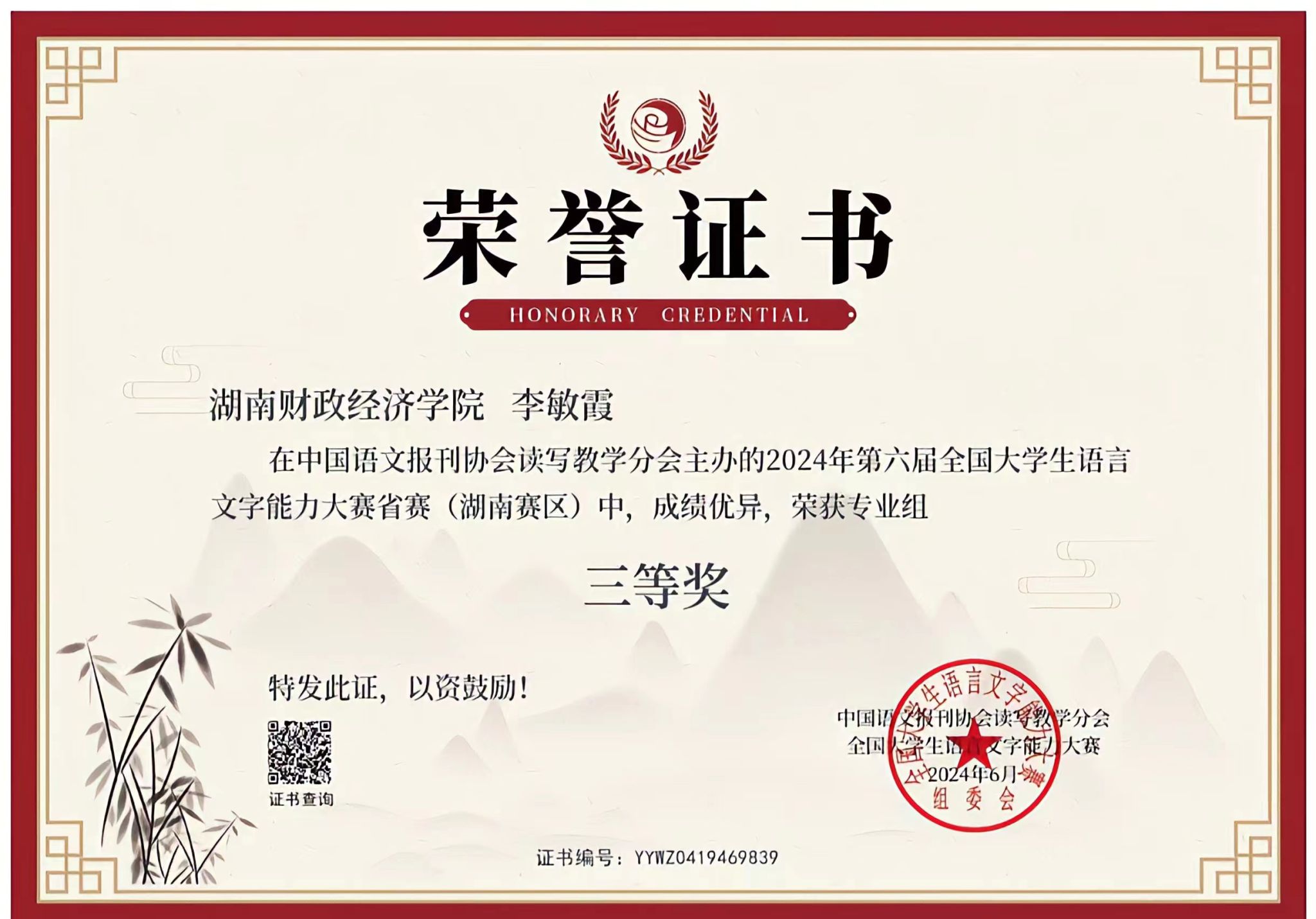 本次大赛由中国语文报刊协会读写教学分会主办,旨在测试大学生的语言文字知识和应用能力,弘扬中国文化,增强大学生规范使用国家通用语言文字的意识,促进语言文字教、学、测协调发展。大赛由省赛与决赛两个阶段组成,分专业组、非专业组、专科生组三个组别,各组分开评奖。经组委会评选,best365官网汉语言文学专业学生沈辉珍获全国专业组二等奖及省赛专业组二等奖,杨佳获省赛专业组二等奖,李敏霞、叶欣怡获省赛专业组三等奖。