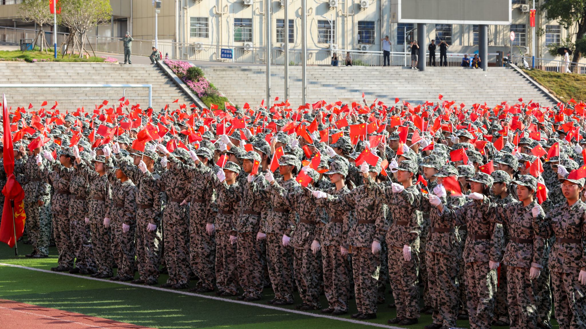 2024级学生军训总结表彰大会在全体师生齐唱《歌唱祖国》的嘹亮歌声中圆满结束。