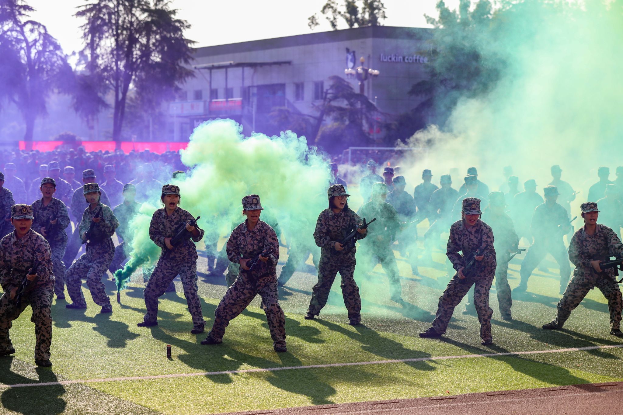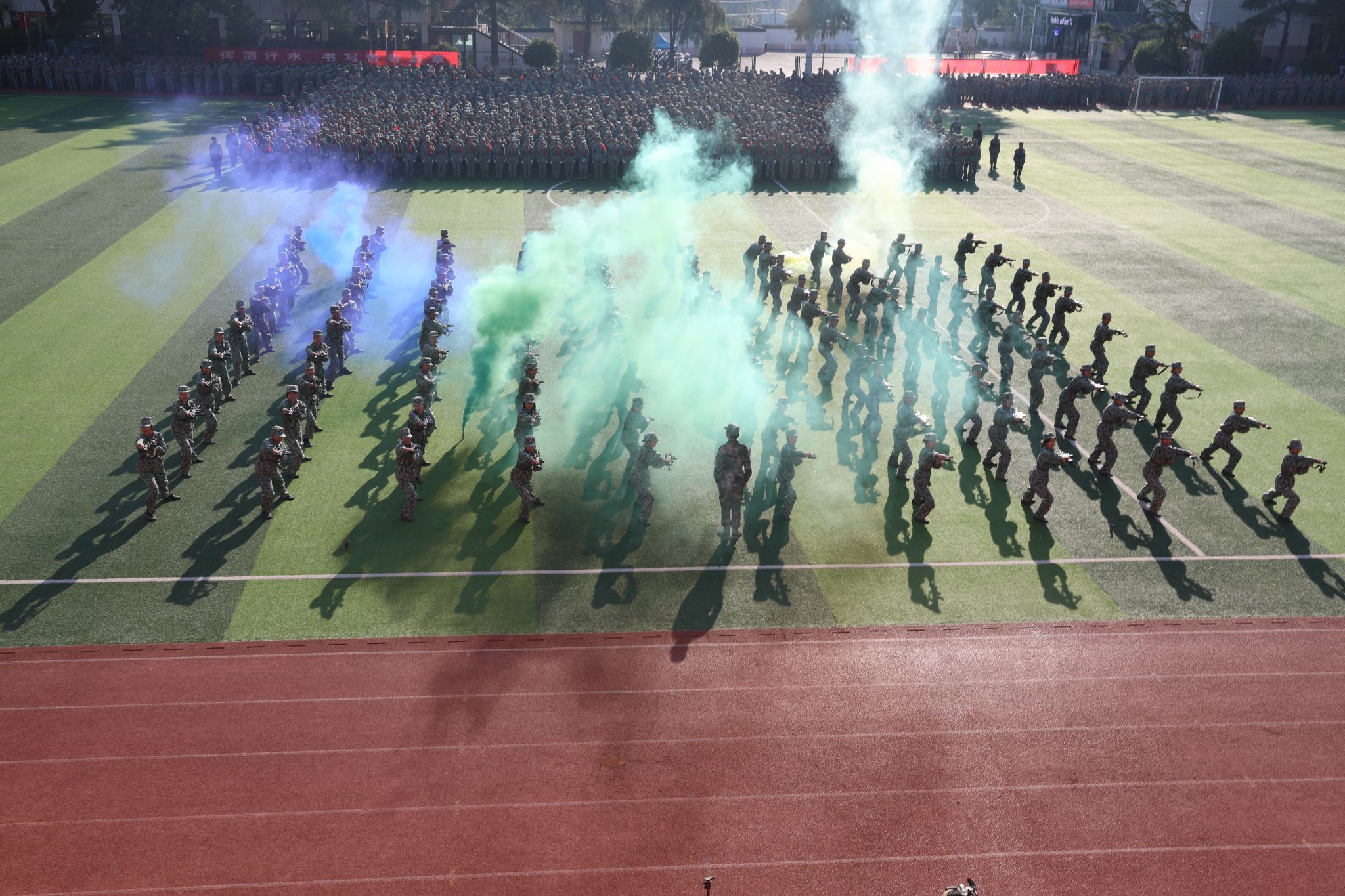 在军训汇报表演中,擒敌拳方阵动作刚强有力,气势磅礴;匕首操方阵、刺杀操方阵在烟雾弹模拟的硝烟弥漫战场,“杀”声嘹亮、攻势犀利,尽显坚韧不拔、勇敢顽强的战斗作风;由2000余名学生组成的文化方阵表演让现场沸腾,他们凭借队列变化,摆出“75”“繁荣昌盛”“幸福安康”“中国地图”等造型为新中国成立75周年送上深情祝福,变换“HUFE 1933-2024”“正德厚生 经世济用”等字样传递他们的爱校情怀。