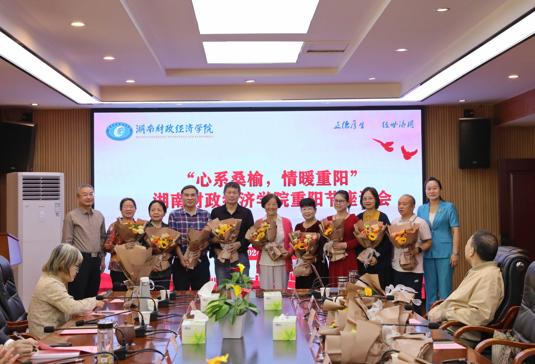 (本网讯)10月11日是中国传统节日“重阳节”,当天上午,学校在办公楼715会议室召开“心系桑榆 情暖重阳”重阳节座谈会,邀请退休老干部、老教师代表欢聚一堂,共贺传统佳节、共叙珍贵情谊、共谋发展新篇。校党委书记杨兰英、校长刘长庚、党委副书记苏玲、副校长刘钟理及相关职能部门负责人参会。苏玲主持会议。