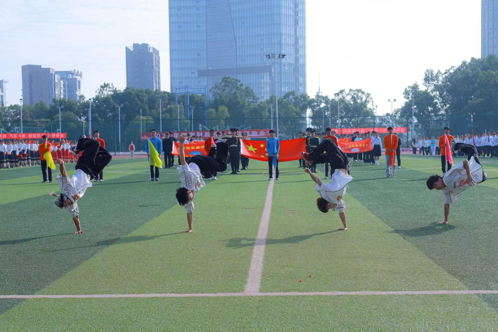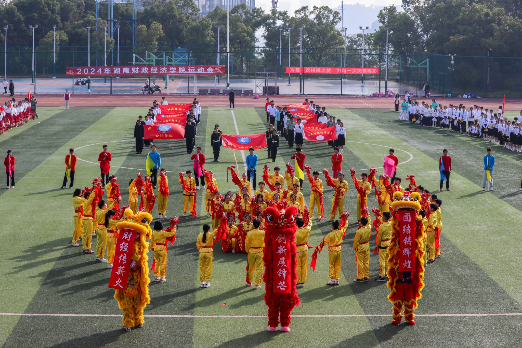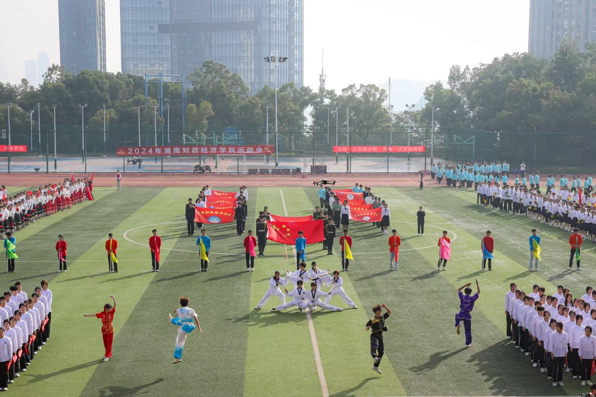 本届运动会开幕式延续往年传统,采用入场仪式与体育节目表演相结合的形式。国旗、彩旗方阵气宇轩昂、步履铿锵,诠释湖财体育精神。来自全校14个二级学院的入场表演活力四射、热情洋溢,彰显学院特色,尽显青春风采。舞龙舞狮、街舞啦啦操、彩带龙、健身健美、体育舞蹈、休闲户外等表演亮点频现,传统与时尚相结合、传承与创新相交融,不仅为师生带来一场震撼的视听盛宴,也充分展示了best365官网在群众性体育活动、民族体育项目等方面取得的成绩和亮点。