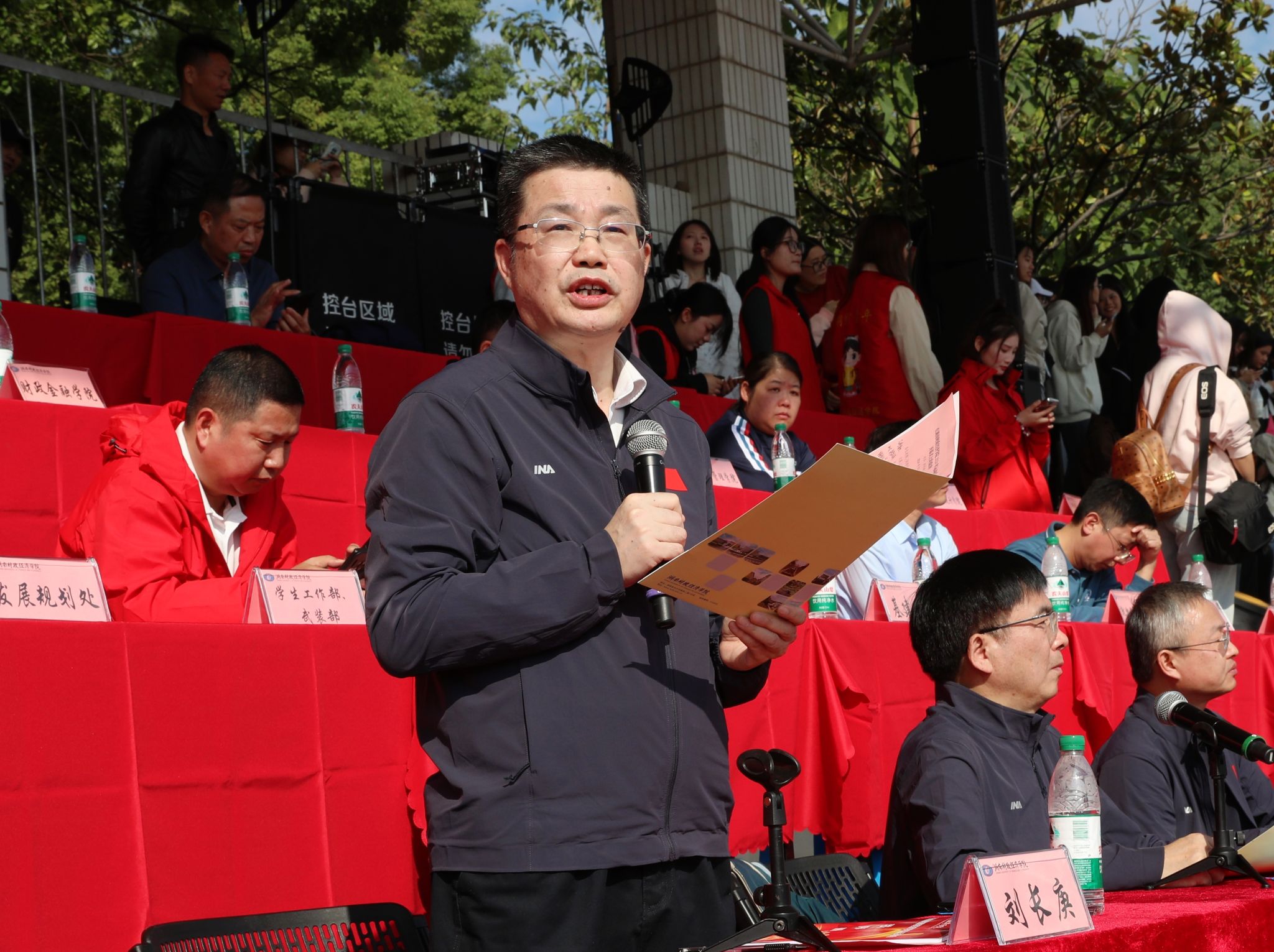 校领导、各单位负责人等出席了25日上午的开幕式,校党委书记杨兰英宣布本届运动会开幕,校长刘长庚致开幕辞,副校长郭国强主持开幕式。