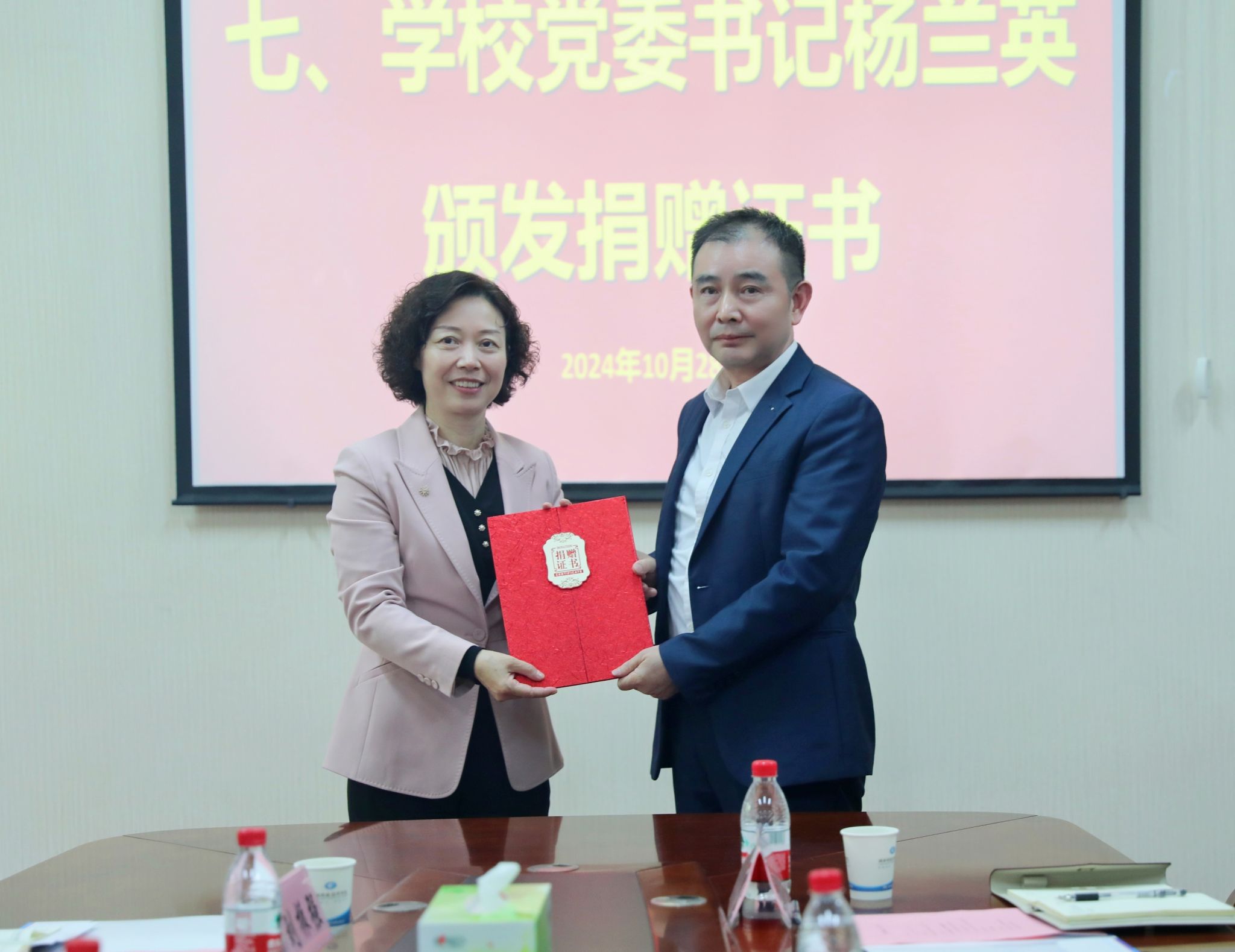 杨兰英代表学校向孙公民颁发捐赠证书,对孙公民助力学校发展的捐赠行为给予高度赞赏和充分肯定。她表示,校友孙公民的善举不仅体现了对母校的深厚情感,更展现了对教育事业和社会的责任担当。学校厚生教育基金将为贫困学生提供有力经济支持,帮助他们顺利完成学业,助力学校教育事业高质量发展。