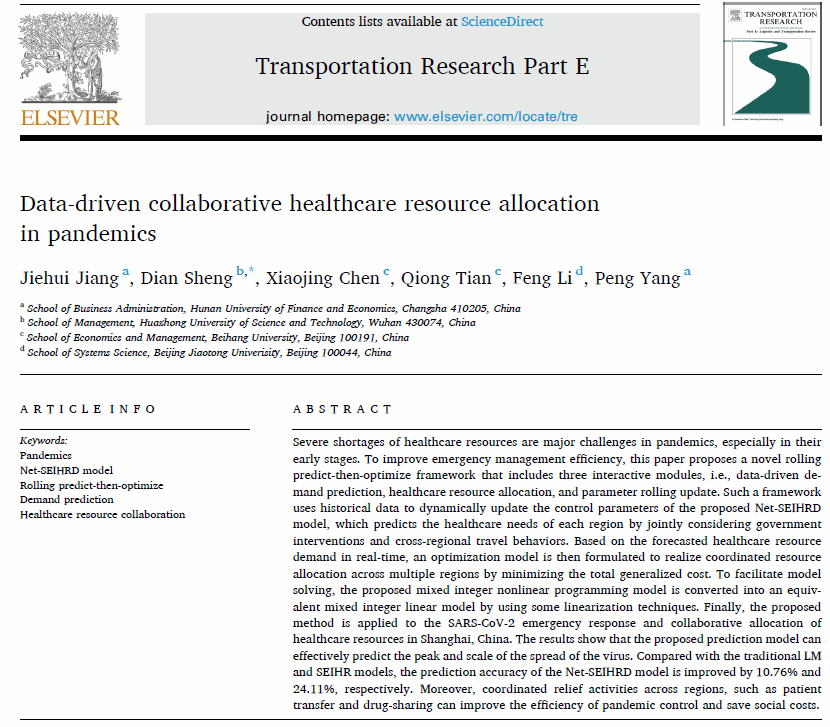 (本网讯)近日,best365官网工商管理学院物流管理系教师蒋杰辉以第一作者身份在运输管理和物流供应链领域国际权威期刊《Transportation Research Part E: Logistics and Transportation Review》发表了题为“Data-driven collaborative healthcare resource allocation in pandemics”的论文。