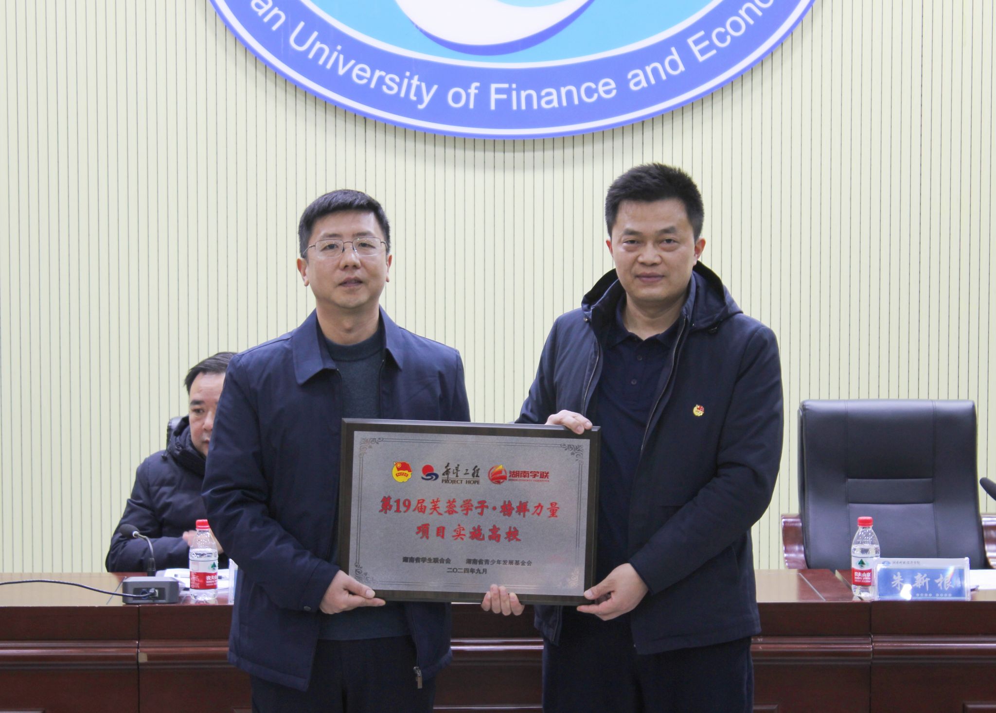 朱新根代表湖南省青少年发展基金向学校授予第十九届“芙蓉学子·榜样力量”项目实施高校牌匾。