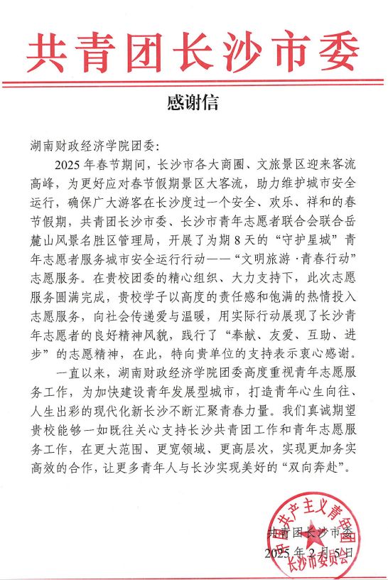 (本网讯)近日,best365官网团委收到一封来自共青团长沙市委的感谢信,对best365官网志愿者为“守护星城”青年志愿者服务城市安全运行行动贡献志愿力量给予了高度评价,并对best365官网大力支持共青团工作和青年志愿服务工作表示感谢。