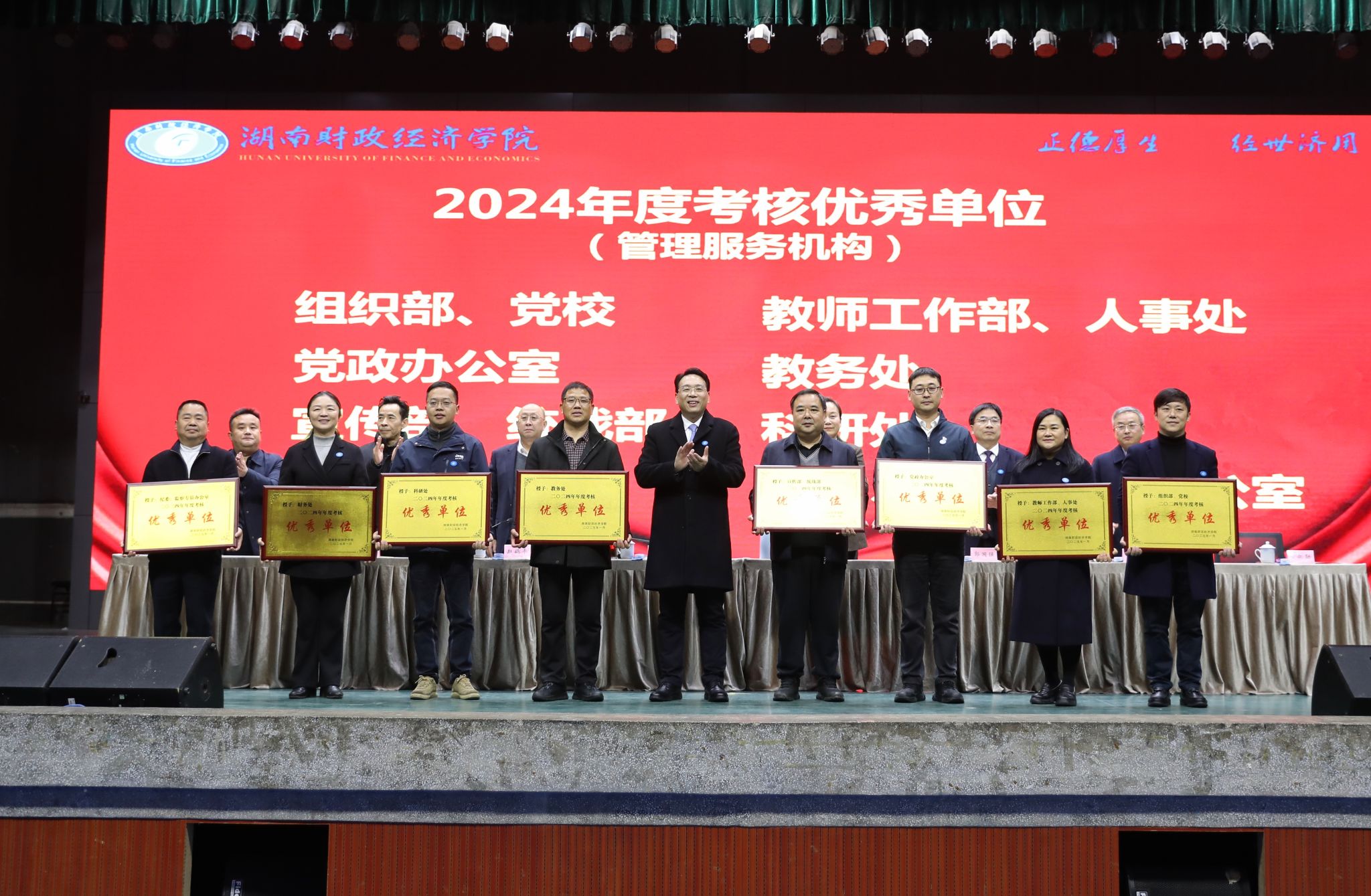 副校长郭国强宣读了学校2024年度考核优秀单位名单,全体校领导为获奖单位颁奖。