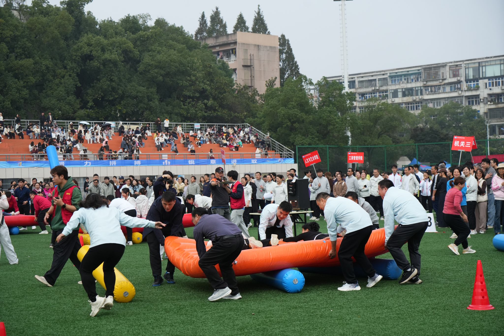 本次运动会共设“鸿运当头”“车轮滚滚”“薪火相传”“迎面接力”四个团体项目,每个项目都巧妙融合了趣味性与竞技性,既考验个人身体素质,又强调团队协作精神。赛场上,加油声、呐喊声、欢笑声此起彼伏,教职工们全情投入、斗志昂扬、配合默契,展现出课堂之外的别样风采。