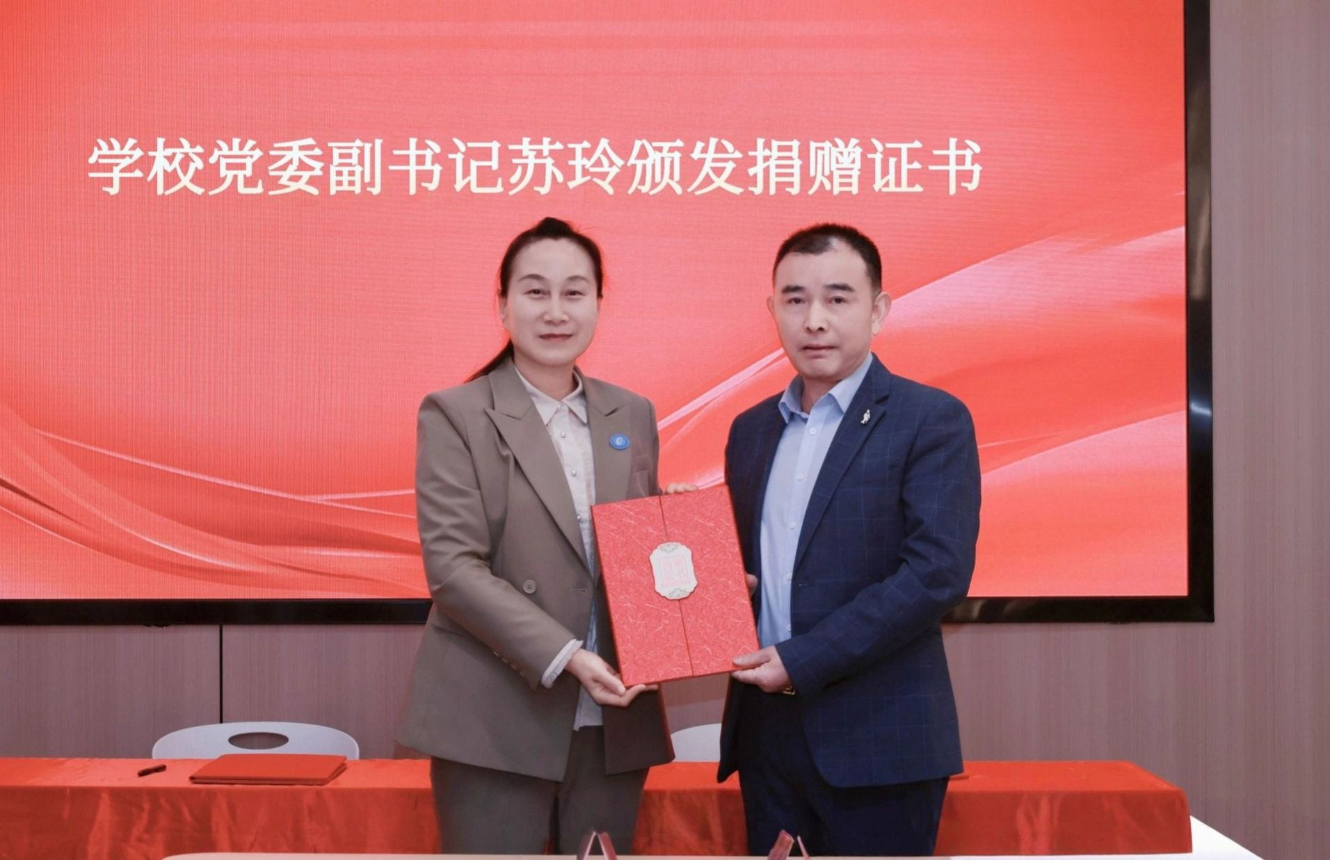 苏玲(左)为孙公民(右)颁发捐赠证书