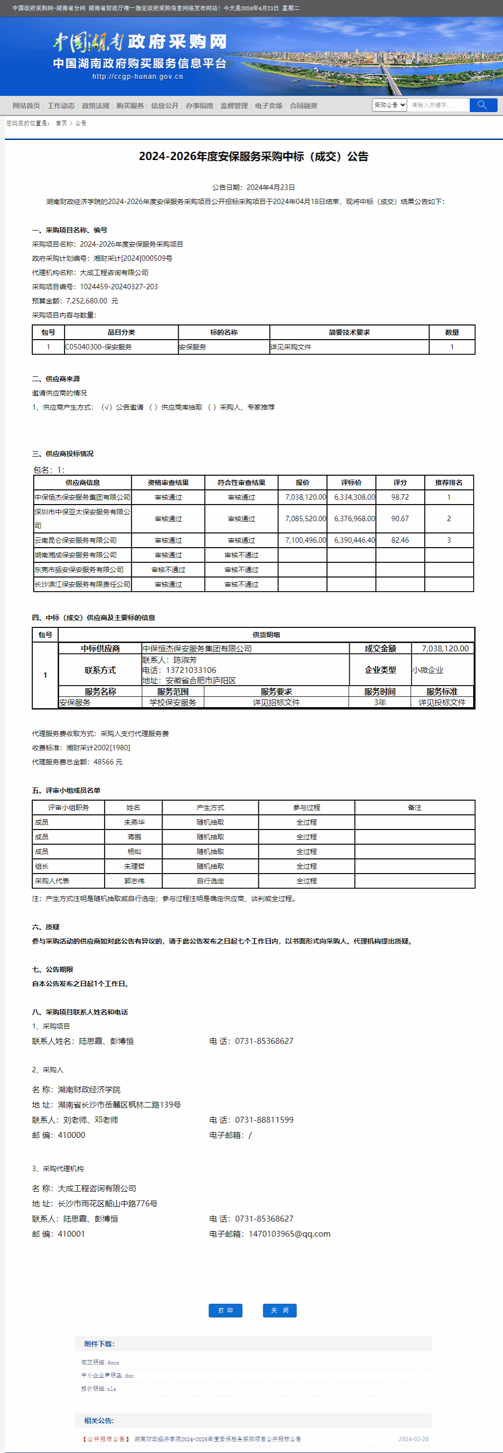 湖南省政府采购网:best365中国官方网站2024-2026年度安保服务采购中标(成交)公告