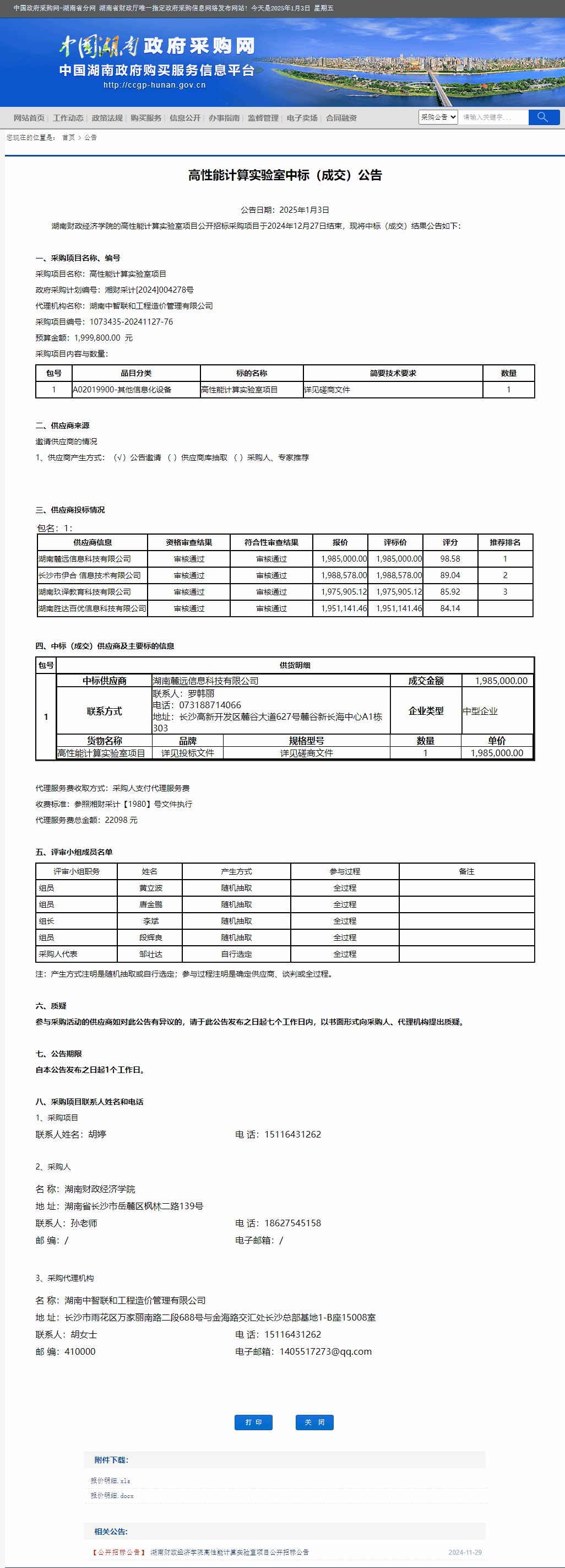 湖南省政府采购网:best365中国官方网站高性能计算实验室中标(成交)公告