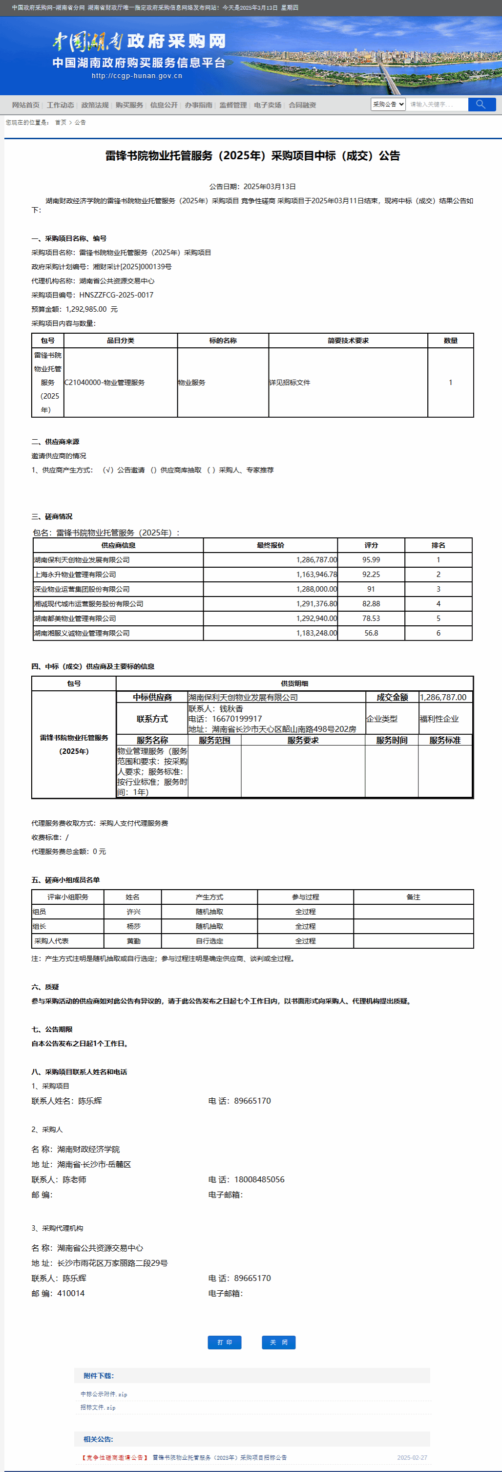 湖南省政府采购网:best365中国官方网站雷锋书院物业托管服务(2025年)采购项目中标(成交)公告