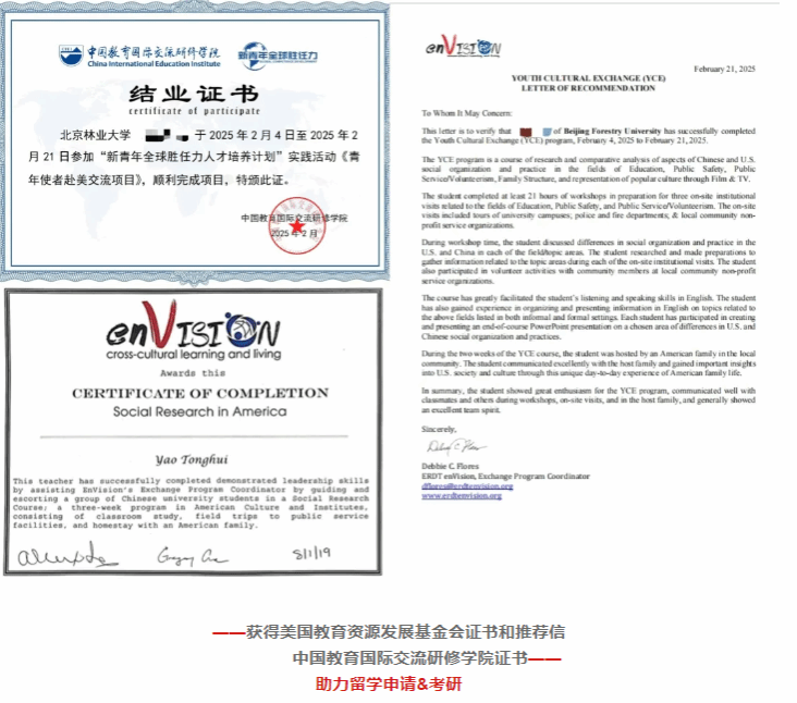 参与并完成整个项目的学生将获得由中国教育国际交流研修学院颁发的实践证书,美国执行机构的结业证书和推荐信。