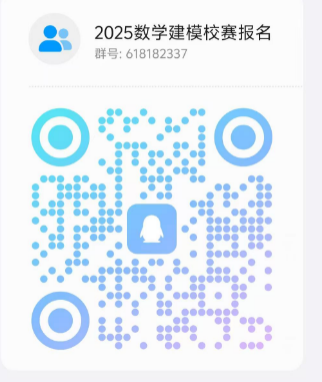 3.报名方式:网上报名,各参赛队遴选一名队长,队长加QQ群618182337(备注班级、姓名),同时填写参赛队伍报名表(附表1,文档名示例:张三组数学建模报名表),将WORD文档上传至报名qq群618182337,群二维码为:
