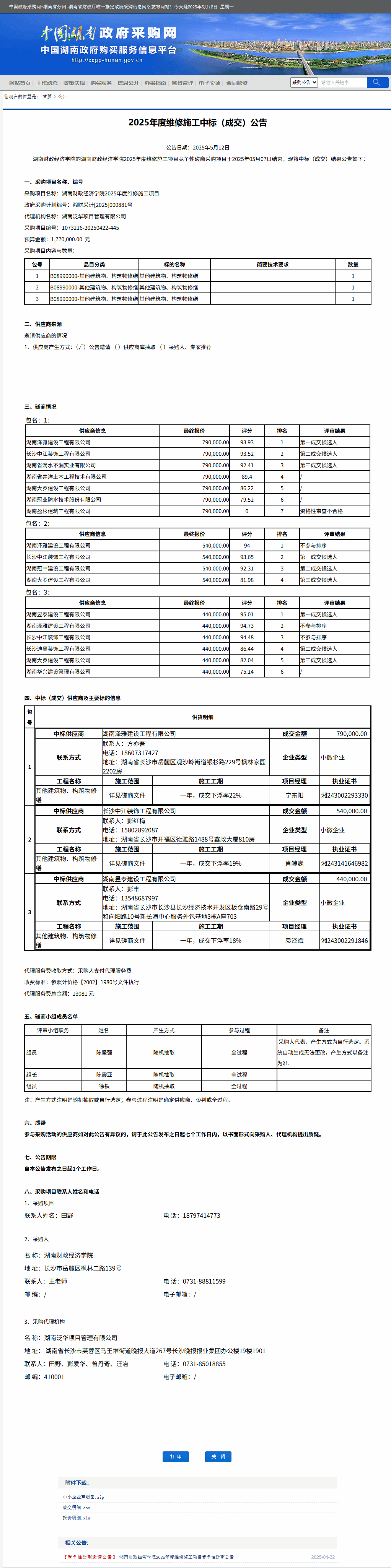 湖南省政府采购网:best365中国官方网站2025年度维修施工中标(成交)公告