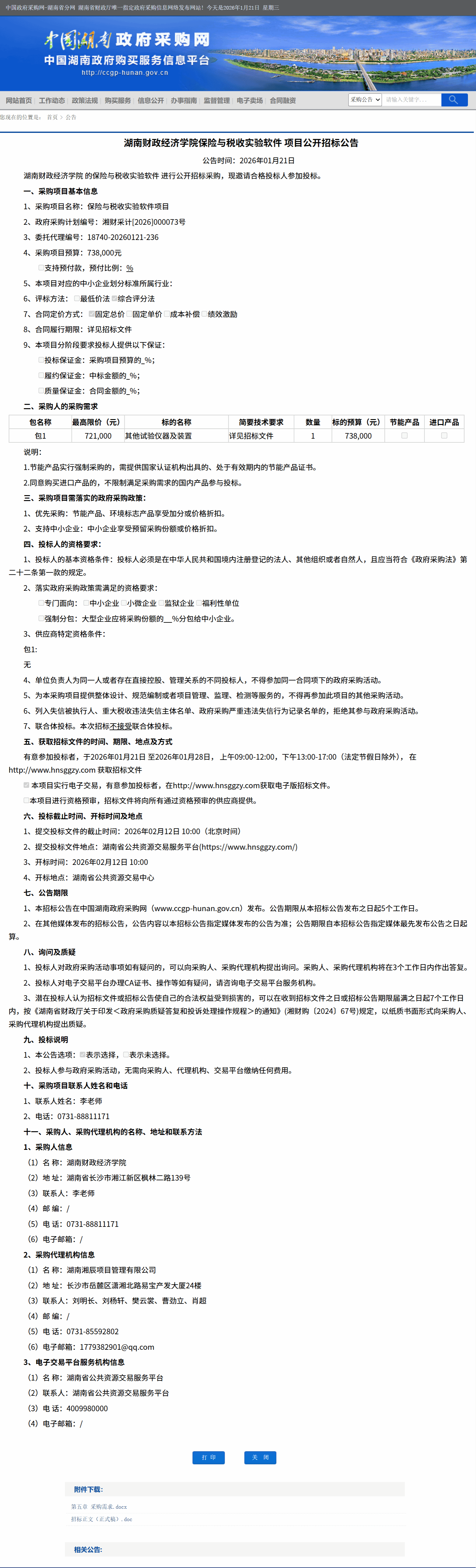 湖南省政府采购网:best365中国官方网站保险与税收实验软件项目公开招标公告