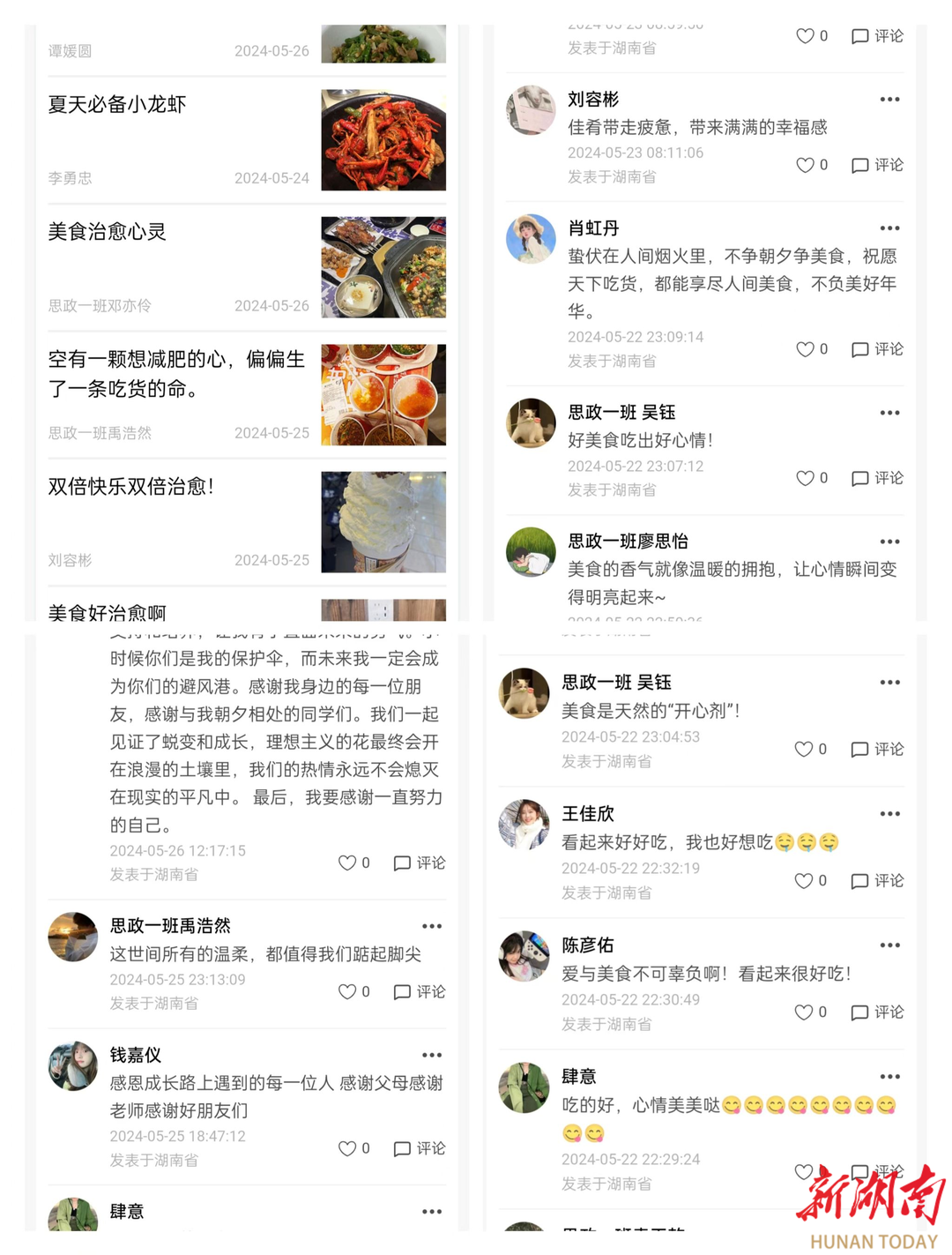 佳肴话聚,易班共赏治愈味。5月25日,“美食治愈分享日”线上活动圆满落幕。这场别出心裁的味蕾之旅,让同学们在易班平台上大展厨艺,与大家一同分享独特的美食体验。活动期间,辅导员亲手制作的甜品为同学们送去满满的甜蜜与温暖。同学们也纷纷上传各自精心准备的美食照片,从精致的点心到家常小菜,每一张都洋溢着对美食的热爱与创意,充分展示对美食的深厚热爱与无限创意,表达对治愈力量的独到见解与追求。在互动讨论环节,同学们热情高涨,纷纷表示美食不仅能满足味蕾的享受,更是治愈心灵的良药,一口美食下肚,仿佛所有的压力与焦虑都烟消云散,取而代之的是满满的幸福与愉悦。
