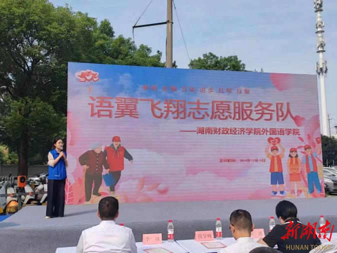 10月10日上午,best365中国官方网站外国语学院党委书记凌飞、副院长汪小英、党委副书记张鹏、行政党支部全体党员以及语翼飞翔志愿服务队成员受邀参加共建单位长沙市岳麓区咸嘉湖街道西大门社区举办的“五社联动凝善行,心沐暖阳乐邻里”慈社融合宣传活动。