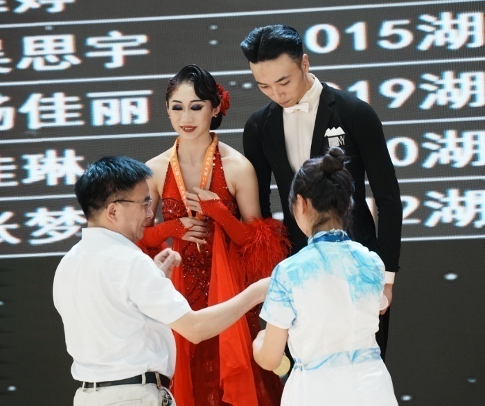 郭国强为学院组体育舞蹈摩登舞五项冠军得主谢蓝、杨瑞莹颁奖 彭莹璐/摄
