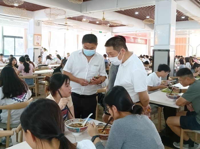 在校园超市和食堂,肖湘愚、刘长庚仔细查看了商品、菜品的种类、份量和价格,现场询问了就餐学生的用餐感受和意见建议。肖湘愚、刘长庚要求相关职能部门做好物价和食品安全的监管,要求服务商增强服务意识、提升服务质量。