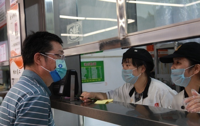 刘长庚(左)了解食堂菜品的种类、份量和价格 陈治丽/摄