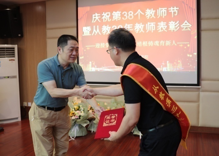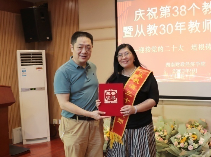 肖湘愚为受表彰教师颁发荣誉证书并赠送鲜花
