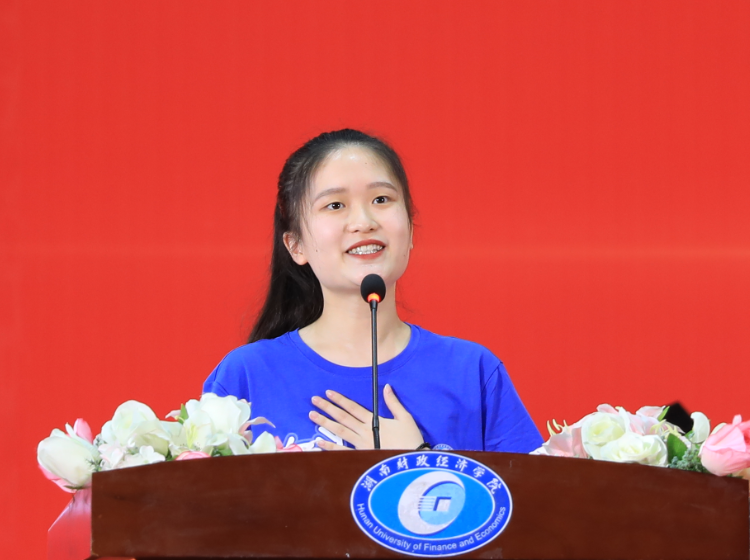 毕业生代表、外国语学院2018级日语班曾琼回忆了在校四年的学习成长历程,代表2022届毕业生表达了对学校、老师的感激之情和传承校训精神、怀揣梦想、报效国家的信心与决心。