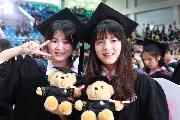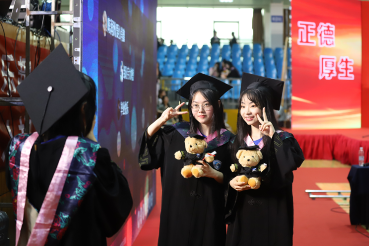 毕业典礼暨学士学位授予仪式在全场师生高声齐唱校歌中圆满结束,许多毕业生在馆内外以各种形式合影留念,把最美的笑容定格在这一刻。 (何妍/文 何妍 张珍妮 马海彬/图 )
