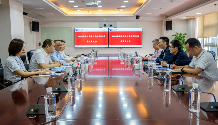 在财信证券股份有限公司,财信证券党委书记、董事长刘宛晨,党委副书记、董事会秘书、财务总监杨光,党委委员、副总裁曾小龙接待刘寒波一行并座谈。刘宛晨详细介绍了集团及公司概况、公司业务、发展战略、人才培养与招聘情况。刘寒波介绍了学校的发展现状、办学定位、师资力量、人才培养特色等。双方就人才共同培养、毕业生就业实践、暑期班课程共建等进行了充分交流并达成合作意向。