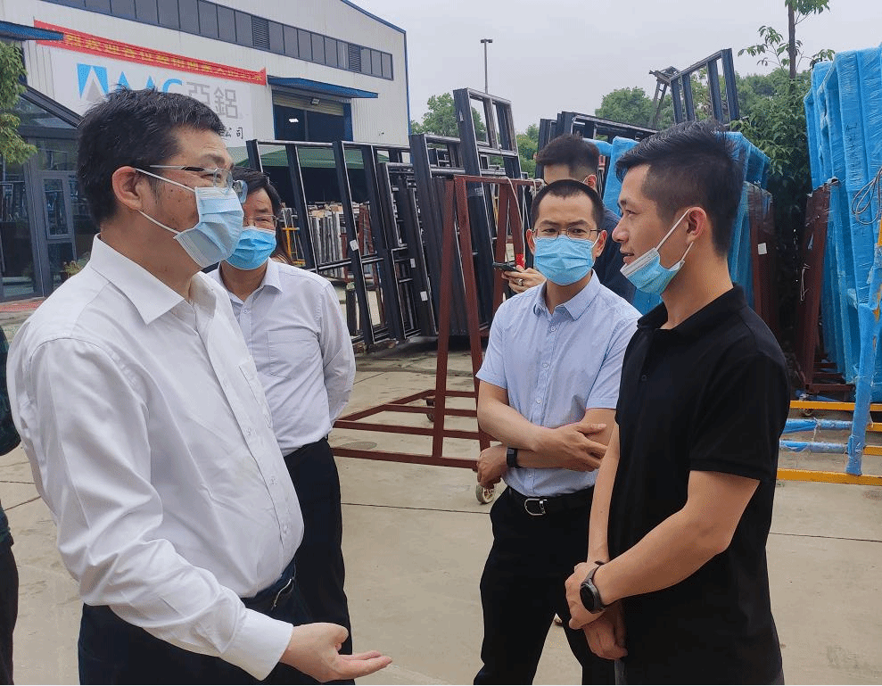 刘长庚(左)与企业负责人交流