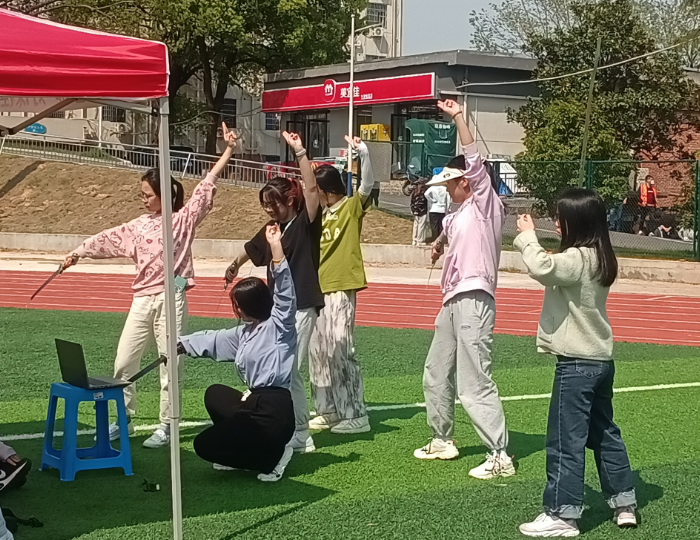 best365中国官方网站体育学院教师戴狄夫正通过腾讯会议平台在线教授雷锋校区剑术班学生初级剑套路的动作要领。学生们在操场上认真观看视频,跟着老师的讲解练习。