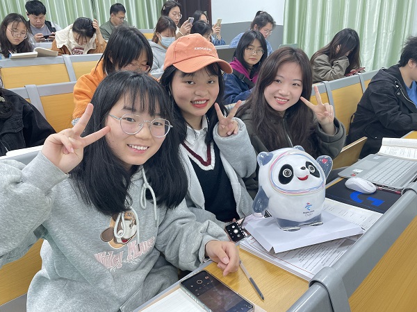 学生与冰墩墩合影