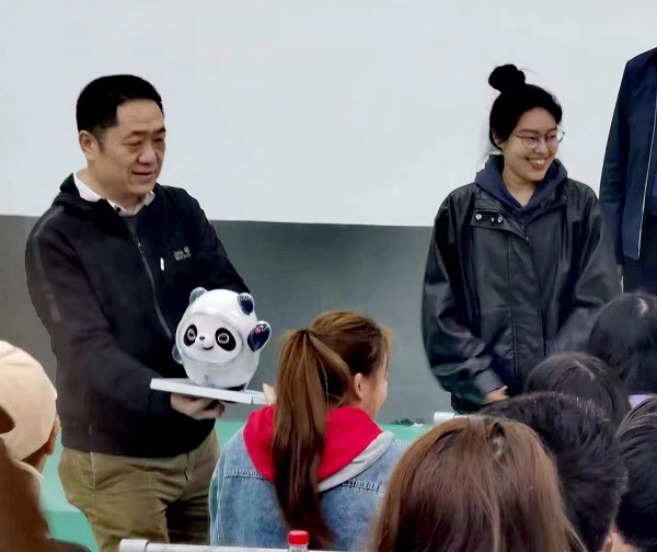 肖湘愚(左)给同学们赠送冰墩墩